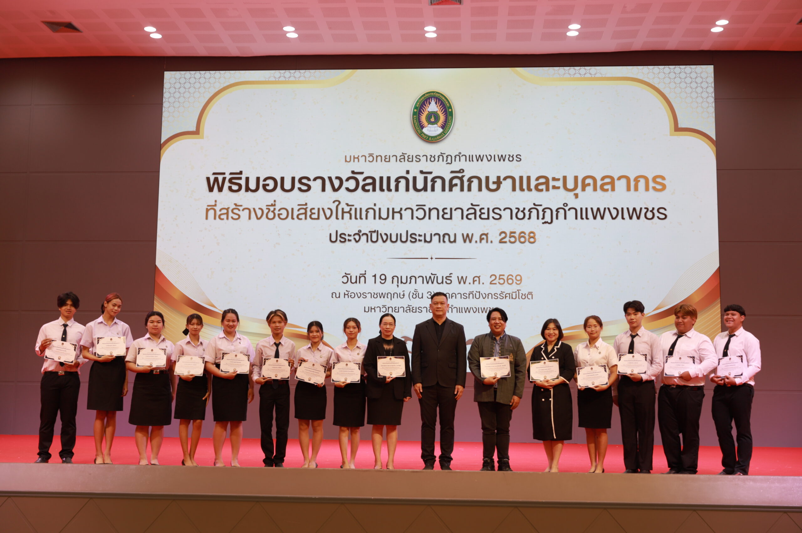 พิธีมอบรางวัลนักศึกษาและบุคลากรที่สร้างชื่อเสียงให้แก่มหาวิทยาลัยราชภัฏกำแพงเพชร ประจำปีงบประมาณ พ.ศ. 2568ด้านการผลิตบัณฑิต19/02/2569 รายละเอียด