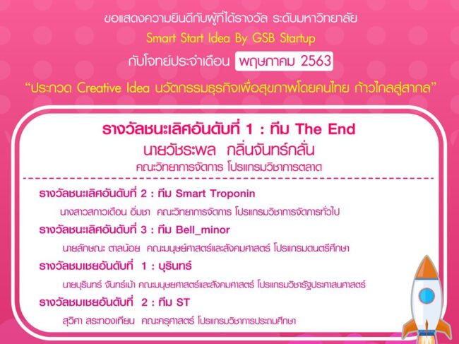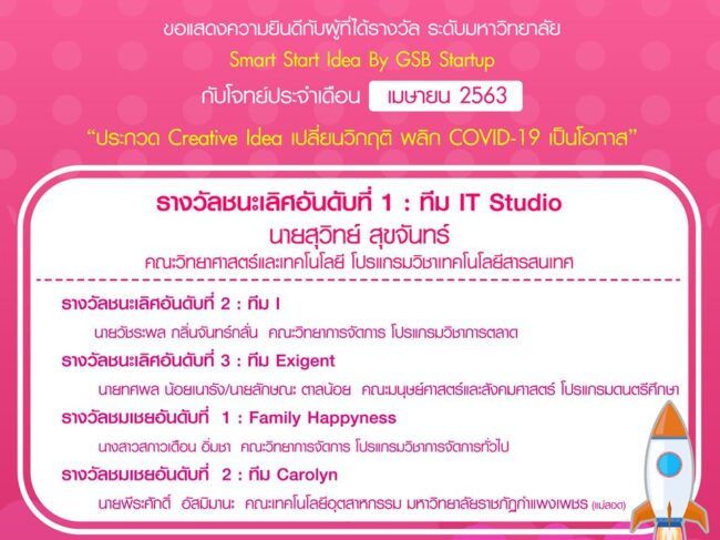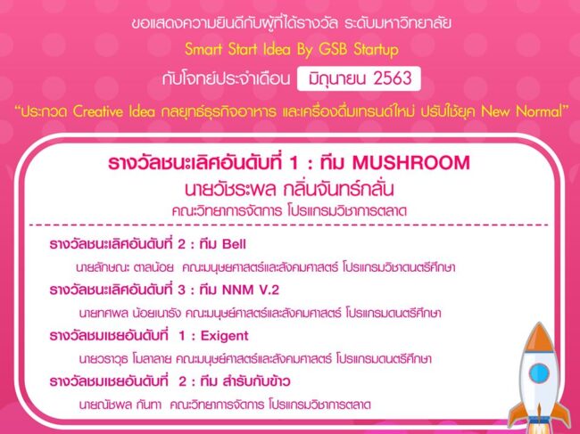 ขอแสดงความยินดีกับ…ตัวแทนนักศึกษาคณะวิทยาการจัดการ มหาวิทยาลัยราชภัฏกำแพงเพชร ที่ได้รับรางวัลจากการประกวดโจทย์ ท้าประลอง Idea WoW ประจำเดือนมิถุนายน 2563 “กิจกรรม ประกวด Idea สร้างสรรค์ Smart Start Idea by GSB Startup ภายใต้โจทย์ “Creative Idea กลยุทธ์ธุรกิจอาหาร และเครื่องดื่มเทรนด์ใหม่ ปรับใช้ยุค New Normal” โดยธนาคารออมสิน ร่วมกับมหาวิทยาลัยราชภัฏกำแพงเพชร จำนวน 2 รางวัล ดังนี้ 🔸 ทีม MUSHROOM นายวัชระพล กลิ่นจันทร์กลั่น โปรแกรมวิชาการตลาด ได้รับรางวัลชนะเลิศ อันดับ 1 🔸 ทีม สำรับกับข้าว นายณัชพล กันทา โปรแกรมวิชาการตลาด ได้รับรางวัลชมเชย อันดับ 2