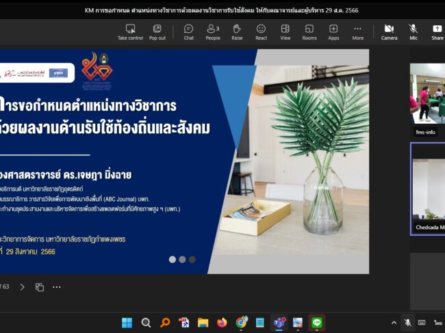 วันที่ 29 สิงหาคม 2566 เวลา 08.30 น.เป็นต้นไป คณะวิทยาการจัดการ มหาวิทยาลัยราชภัฏกำแพงเพชร ได้ดำเนินการจัดอบรม ในหัวข้อ “การขอกำหนดตำแหน่งทางวิชาการด้วยผลงานวิชาการรับใช้สังคม (ออนไลน์)” ให้กับคณาจารย์คณะวิทยาการจัดการ และบุคลากรที่สนใจ โดยได้รับเกียรติจากรองศาสตราจารย์ ดร.เจษฎา มิ่งฉาย รองอธิการบดีมหาวิทยาลัยราชภัฏอุตรดิตถ์ เป็นวิทยากรให้ความรู้ในครั้งนี้ ณ ห้องประชุม ชั้น 1 คณะวิทยาการจัดการ มหาวิทยาลัยราชภัฏกำแพงเพชร