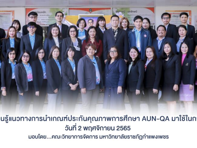 วันที่ 2 พฤศจิกายน 2565 เวลา 08.30 น.เป็นต้นไป ผู้บริหาร คณาจารย์ และบุคลากรคณะวิทยาการจัดการ มหาวิทยาลัยราชภัฏกำแพงเพชร ได้เข้าร่วมต้อนรับคณะศึกษาดูงานจากคณะวิทยาการจัดการ มหาวิทยาลัยราชภัฏอุตรดิตถ์ โดยมีผู้ช่วยศาสตราจารย์ ดร.ขวัญดาว แจ่มแจ้ง รองอธิการบดีฝ่ายวางแผน ประกันคุณภาพการศึกษาและบริการวิชาการ กล่าวต้อนรับผู้ช่วยศาสตราจารย์สินีนาถ วิกรมประสิทธิ คณบดี พร้อมด้วยคณาจารย์ และบุคลากรคณะวิทยาการจัดการ มหาวิทยาลัยราชภัฏอุตรดิตถ์ โดยมีวัตถุประสงค์เพื่อศึกษาดูงานและร่วมแลกเปลี่ยนเรียนรู้แนวทางการนำเกณฑ์ประกันคุณภาพการศึกษา AUN-QA มาใช้ในการจัดการเรียนการสอน ณ ห้องประชุมรวงผึ้ง ชั้น 8 อาคารเรียนรวมและอำนวยการ (อาคาร 14) มหาวิทยาลัยราชภัฏกำแพงเพชร