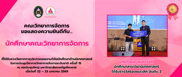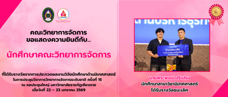 คณะวิทยาการจัดการ ขอแสดงความยินดีกับ… ภานุพงศ์ สังข์ทอง นักศึกษาสาขาวิชาการจัดการธุรกิจ ได้รับรางวัลรองชนะเลิศอันดับที่ 1 จากการแข่งขันประดิษฐ์สิ่งของจากวัสดุเหลือใช้ มหาวิทยาลัยราชภัฏกำแพงเพชร ประจำปี 2569 “เหลือใช้ ไม่เหลือทิ้ง ใช้ได้จริง รักษ์สิ่งแวดล้อม สไตล์ วัยใส Gen…z….” ระดับอุดมศึกษา หัวข้อ “ประดิษฐ์ของใช้ ผลิตภัณฑ์และของที่ระลึก” เมื่อวันที่ 21 มกราคม 2569