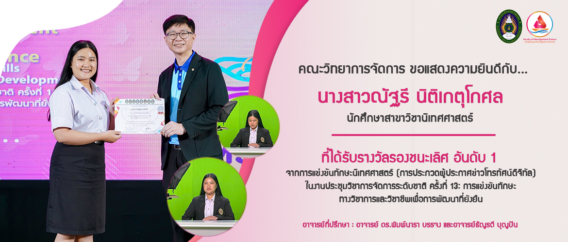 คณะวิทยาการจัดการ ขอแสดงความยินดีกับ….นางสาวณัฐรี นิติเกตุโกศล นักศึกษาสาขาวิชานิเทศศาสตร์ ที่ได้รับรางวัลรองชนะเลิศ อันดับที่ 1