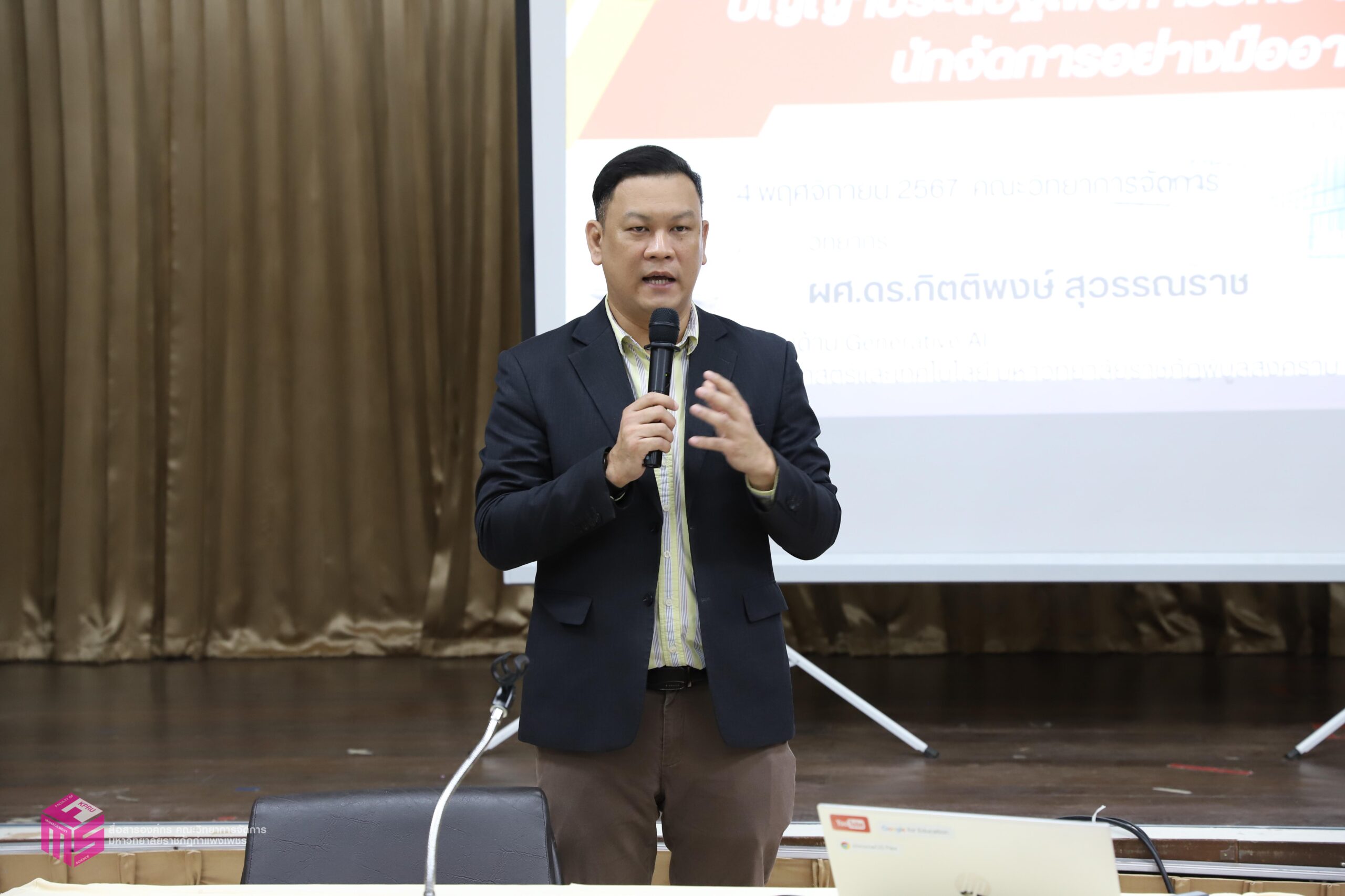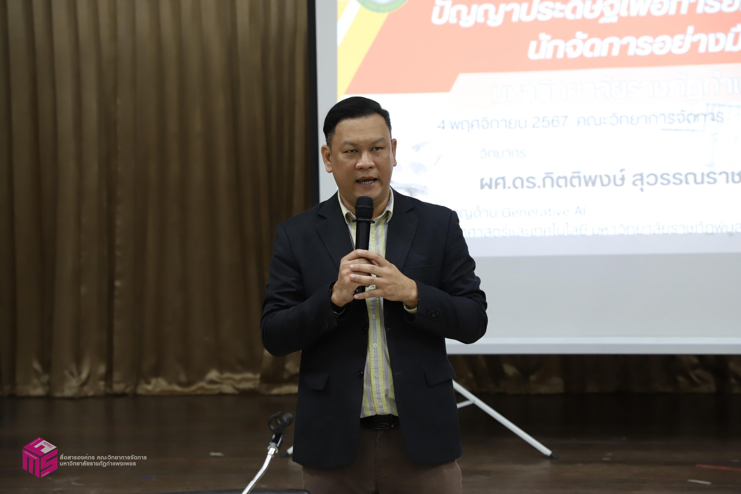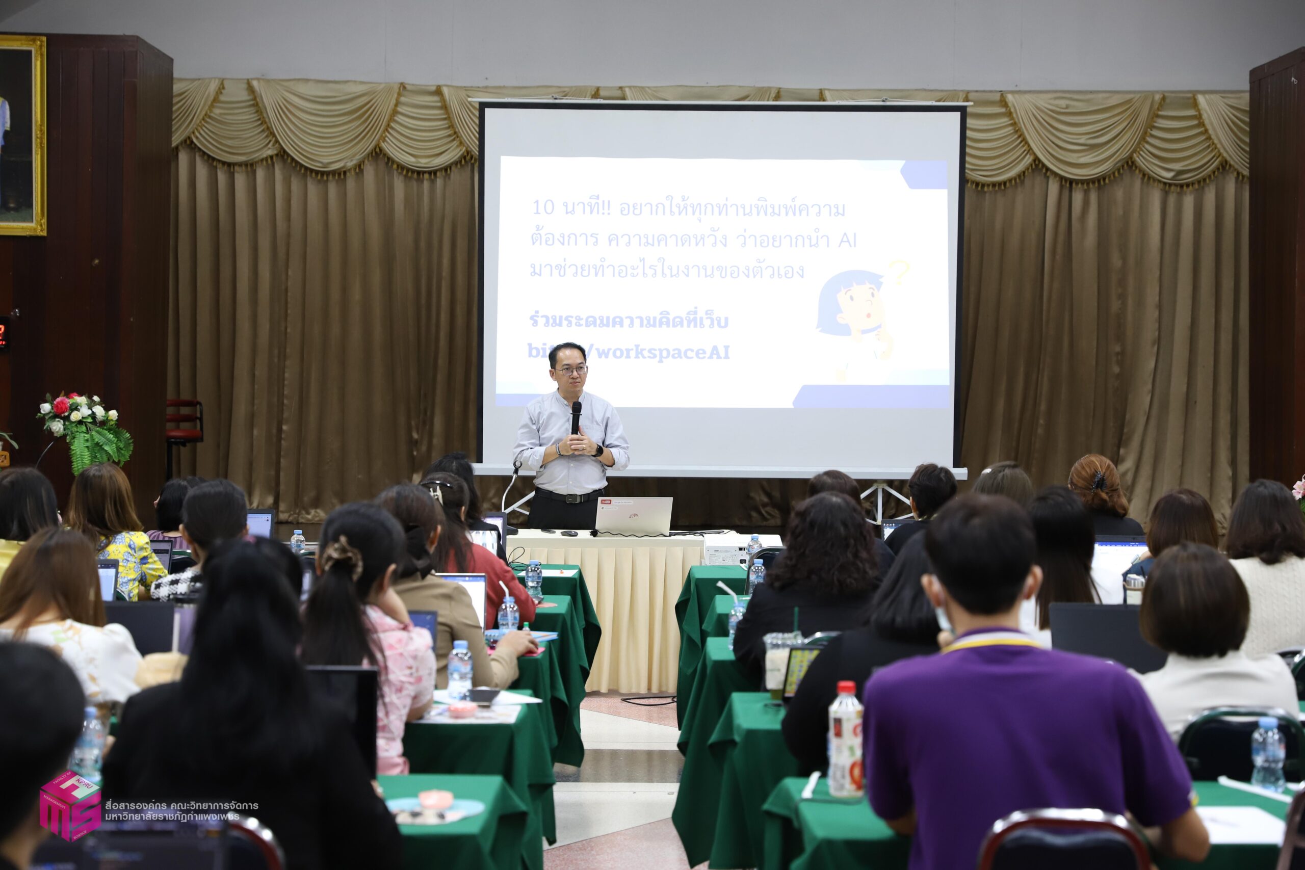 วันที่ 4 พฤศจิกายน 2567 เวลา 08.30 น.เป็นต้นไป หลักสูตรบริหารธุรกิจมหาบัณฑิต สาขาวิชาการจัดการสมัยใหม่ (MBA) คณะวิทยาการจัดการ มหาวิทยาลัยราชภัฏกำแพงเพชร ได้จัดอบรม “ปัญญาประดิษฐ์ AI เพื่อการยกระดับศักยภาพนักจัดการอย่างมืออาชีพ” โดย วิทยากร ผู้ช่วยศาสตราจารย์ ดร.กิตติพงษ์ สุวรรณราช ผู้เชี่ยวชาญด้าน Generative AI และ Google Certified Trainer มหาวิทยาลัยราชภัฏพิบูลสงคราม โดยการบรรยายประกอบด้วย การใช้ AI ในการร่างหนังสือ หรือเอกสารต่างๆ และงานแปล การใช้ AI เพื่อสร้างภาพประกอบสื่อประชาสัมพันธ์ และสื่ออื่นๆ การใช้ AI ในการถอดคลิปเสียงเพื่อสร้างรายงานการประชุม การใช้ AI ในการสรุปความรู้ เขียนตำรา และข้อมูลวิจัย การประยุกต์ใช้ AI ในด้านต่างๆ เพื่อคุณภาพงานที่ดีและรวดเร็วขึ้น และหัวข้ออื่นๆ ณ ห้องประชุม ชั้น 1 คณะวิทยาการจัดการ มหาวิทยาลัยราชภัฏกำแพงเพชร