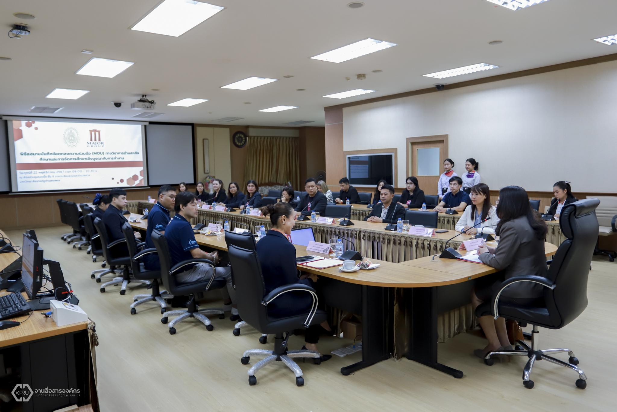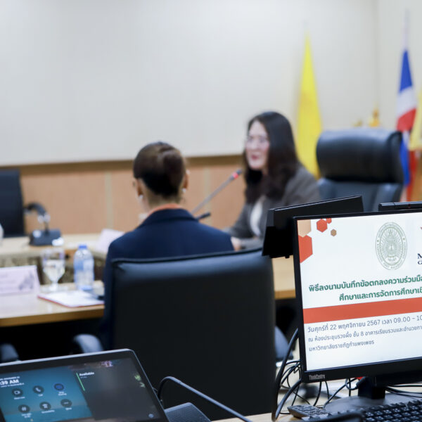 วันที่ 22 พฤศจิกายน 2567 เวลา 09.30 น.เป็นต้นไป คณะวิทยาการจัดการ มหาวิทยาลัยราชภัฏกำแพงเพชร ได้จัดพิธีลงนามบันทึกข้อตกลงความร่วมมือ (MOU) ทางวิชาการด้านสหกิจศึกษาและการจัดการศึกษาเชิงบูรณากับการทำงาน กับบริษัทเมเจอร์ ซีนีเพล็กซ์ กรุ้ป จำกัด (มหาชน) โดยมีผู้ช่วยศาสตราจารย์ ดร.ปรียานุช พรหมภาสิต อธิการบดีมหาวิทยาลัยราชภัฏกำแพงเพชร และนางสาววราพร ละมูลตรี ผู้จัดการฝ่ายบริหารทรัพยากรมนุษย์ เป็นผู้ลงนามบันทึกข้อตกลงความร่วมมือ (MOU) ทางวิชาการด้านสหกิจศึกษาและการจัดการศึกษาเชิงบูรณากับการทำงาน กับบริษัทเมเจอร์ ซีนีเพล็กซ์ กรุ้ป จำกัด (มหาชน) พร้อมด้วย ผู้ช่วยศาสตราจารย์ ดร.ฆัมภิชา ตันติสันติสม รองอธิการบดีฝ่ายวิชาการ ผู้ช่วยศาสตราจารย์การันต์ เจริญสุวรรณ คณบดีคณะวิทยาการจัดการ มหาวิทยาลัยราชภัฏกำแพงเพชร นายณัฐยศ ธูปกระแจะ ผู้ช่วยผู้จัดการแผนกสรรหาว่าจ้าง และนายสกล ช่อดอก ผู้ช่วยผู้จัดการแผนกสรรหาว่าจ้าง บริษัทเมเจอร์ซีนีเพล็กซ์ กรุ้ป จำกัด (มหาชน) ลงนามเป็นพยาน โดยการบันทึกข้อตกลงความร่วมมือในครั้งนี้ คณะวิทยาการจัดการ มหาวิทยาลัยราชภัฏกำแพงเพชร และบริษัทเมเจอร์ ซีนีเพล็กซ์ กรุ้ป จำกัด (มหาชน) ได้ร่วมกันผลิต ออกแบบหลักสูตร และการจัดการเรียนการสอนแบบสหกิจศึกษาและการศึกษาเชิงบูรณาการกับการทำงาน (Cooperative and Work Integrated Education : CWIE ) ร่วมกัน และสร้างการเรียนรู้จากประสบการณ์ทำงานจริง ซึ่งบริษัทพร้อมรับนักศึกษาในหลักสูตรและสาขาวิชาต่างๆ ของมหาวิทยาลัยเข้าปฏิบัติงานในหน่วยงานในฐานะนักศึกษาผู้ปฏิบัติงาน เช่น นักศึกษาสหกิจศึกษาและนักศึกษาฝึกงาน ร่วมมือด้านการศึกษาวิจัย ร่วมกันจัดกิจกรรมถ่ายทอดองค์ความรู้จากภาควิชาชีพสู่ภาคการศึกษา และร่วมกันให้บริการวิชาการกับชุมชน โดยมีระยะเวลาความร่วมมือตั้งแต่วันที่ 1 พฤศจิกายน 2567 – 31 ตุลาคม 2570 ณ ห้องประชุมรวงผึ้ง ชั้น 8 อาคารเรียนรวมและอำนวยการ (อาคาร 14) มหาวิทยาลัยราชภัฏกำแพงเพชร