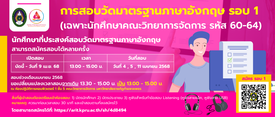 คณะวิทยาการจัดการ ได้กำหนดจัดการสอบวัดมาตรฐานภาษาอังกฤษเสริมต่างๆ ให้แก่นักศึกษาคณะวิทยาการจัดการ รหัส 60-64 ที่ยังตกค้างและไม่ผ่านการสอบภาษาอังกฤษเสริม ช่วงเดือนเมษายน พ.ศ. 2568 รอบที่ 1