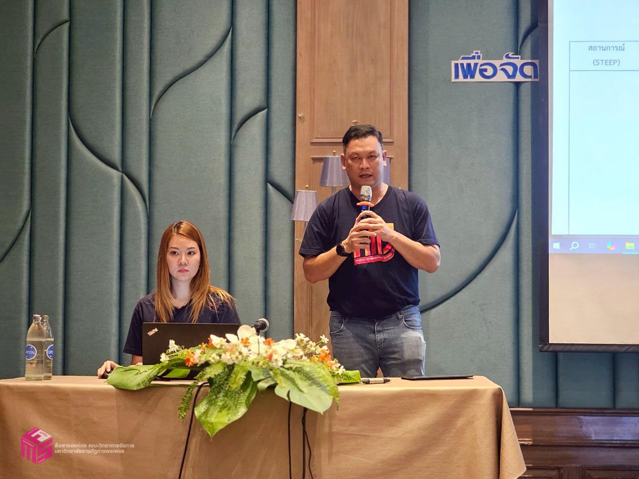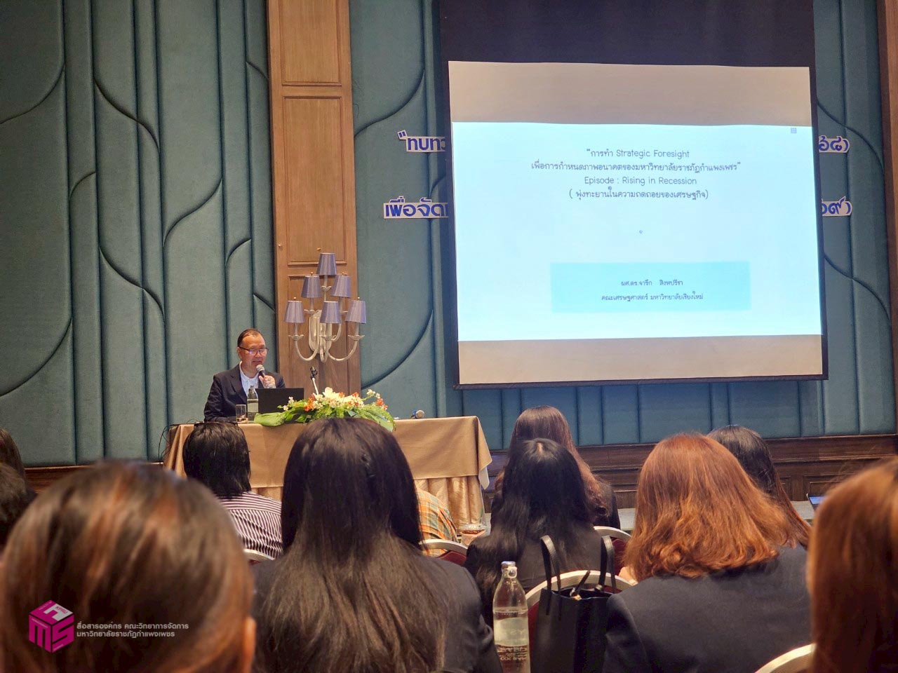 วันที่ 26-28 มีนาคม 2568 ผู้บริหาร คณาจารย์ และบุคลากร คณะวิทยาการจัดการ มหาวิทยาลัยราชภัฏกำแพงเพชร ได้เข้าร่วมการประชุมเชิงปฏิบัติการ “ทบทวนแผนกลยุทธ์ 2566 – 2570 (ฉบับปรับปรุง 2568) และแผนปฏิบัติราชการ ประจำปี 2568 เพื่อจัดทำแผนกลยุทธ์ 2566 – 2570 (ฉบับปรับปรุง 2569) และแผนปฏิบัติราชการ ประจำปี 2569” กิจกรรมที่ 2 โดยในภาคเช้าเป็นกิจจกรรมบรรยายพิเศษเรื่อง การทำ Strategic foresight เพื่อการกำหนดภาพอนาคตของมหาวิทยาลัยราชภัฏกำแพงเพชร โดยวิทยากรผู้ช่วยศาสตราจารย์ ดร.จารึก สิงหปรีชา ผู้อำนวยการศูนย์ศึกษาความเป็นไปได้และประเมินผลกระทบทางเศรษฐกิจและสังคมของโครงการ คณะเศรษฐศาสตร์ มหาวิทยาลัยเชียงใหม่ และภาคบ่ายเป็นกิจกรรมสรุปผลการทบทวนแผนกลยุทธ์ 2566 – 2570 (ฉบับปรับปรุง 2569) ของมหาวิทยาลัยและชี้แจงแนวทางการทบทวนแผนกลยุทธ์ของหน่วยงานระดับคณะ/สำนัก/สถาบัน เชื่อมโยงกับแผนกลยุทธ์มหาวิทยาลัย จากนั้นผู้เข้าร่วมประชุมแบ่งกลุ่มเพื่อร่วมกันทบทวนแผนกลยุทธ์ฯ และนำเสนอแผนกลยุทธ์ 2566 – 2570 (ฉบับปรับปรุง 2569) ณ The Regent Cha Am Beach Resort อำเภอชะอำ จังหวัดเพชรบุรี