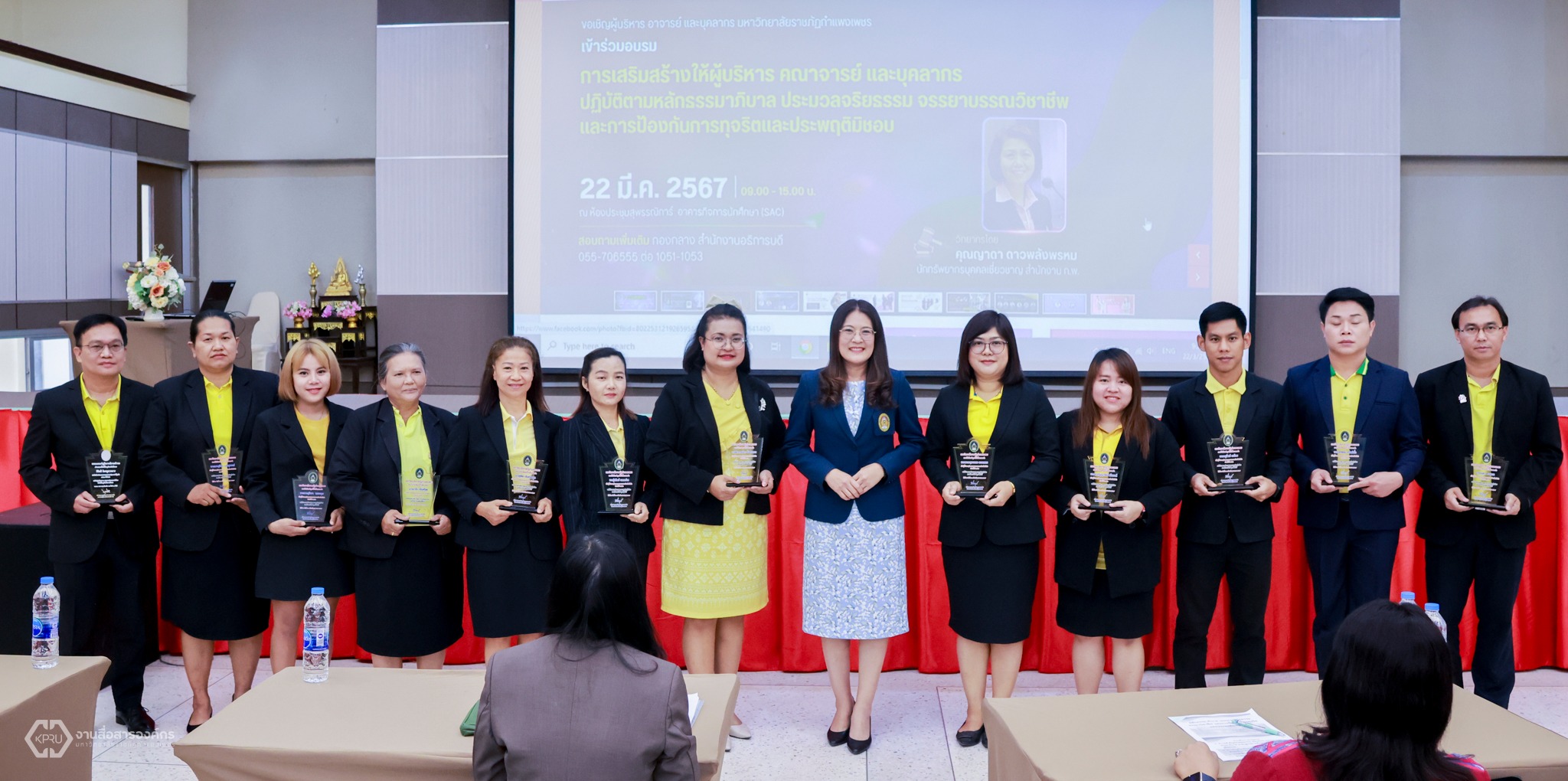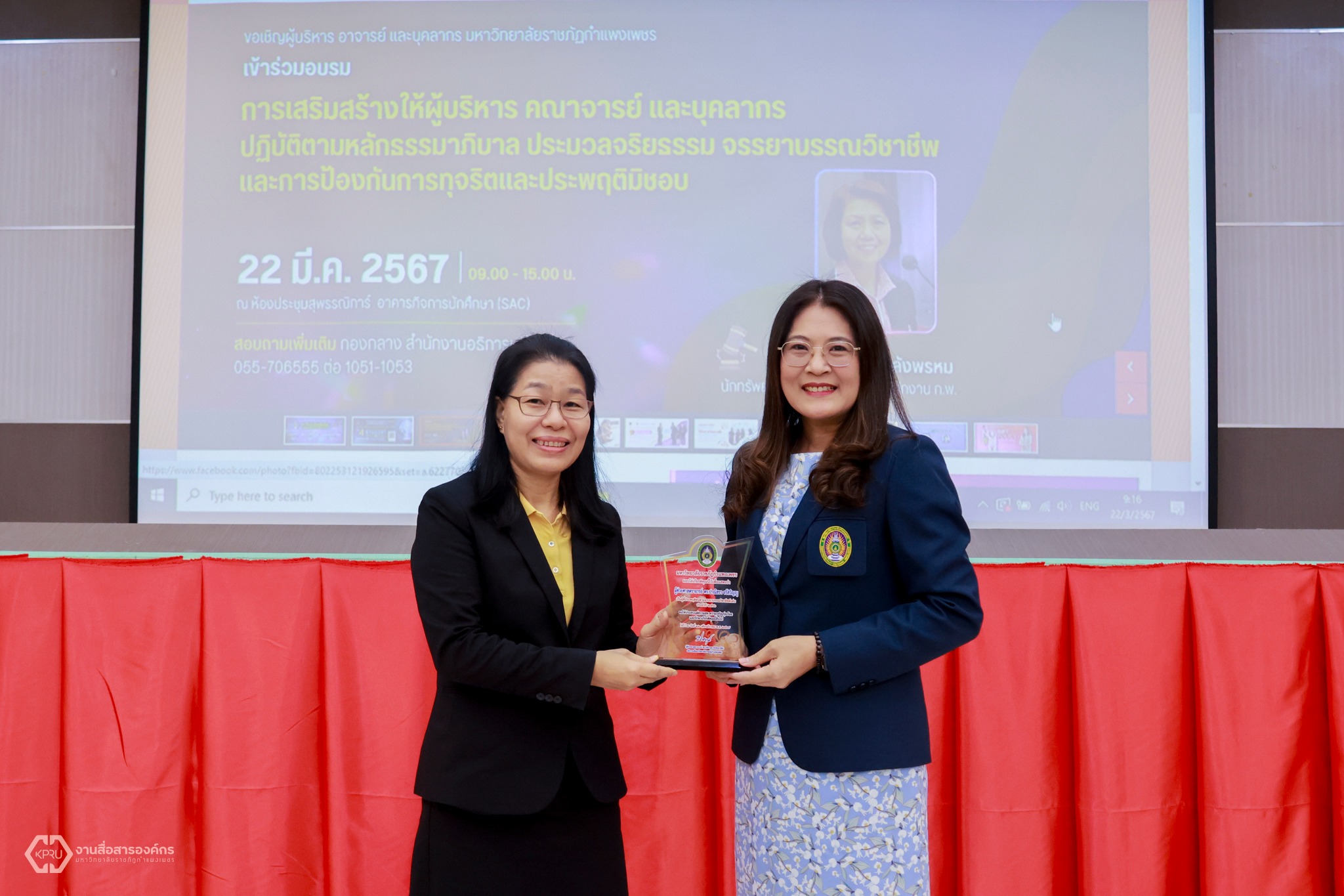 วันที่ 22 มีนาคม 2567 เวลา 08.30 น.เป็นต้นไป ผู้บริหาร คณาจารย์ และบุคลากรคณะวิทยาการจัดการ มหาวิทยาลัยราชภัฏกำแพงเพชร ได้เข้าร่วมโครงการเสริมสร้างให้ผู้บริหาร คณาจารย์ และบุคลากรปฏิบัติตามหลักธรรมาภิบาล ประมวลจริยธรรม จรรยาบรรณวิชาชีพและการป้องกันการทุจริตและประพฤติมิชอบ โดยมีคุณญาดา ดาวพลังพรหม นักทรัพยากรบุคคลเชี่ยวชาญ ศูนย์ส่งเสริมจริยธรรม สำนักงาน ก.พ มาเป็นวิทยากรผู้ทรงคุณวุฒิให้ความรู้ในครั้งนี้ โดยในงานประกอบด้วย การประกาศนโยบายงดให้ งดรับ ของของขวัญ (No Gift Policy) รวมถึงผลประโยชน์อื่นใดในเทศกาลปีใหม่รวมถึงเทศกาลต่างๆ และพิธีมอบโล่ห์ประกาศเกียรติคุณคณาจารย์ที่ได้ประพฤติตนตามจรรยาบรรณวิชาชีพดีเด่น ประจำปี 2566 ซึ่งมีคณาจารย์ และบุคลากรของคณะวิทยาการจัดการ ที่ได้รับโล่ห์ประกาศเกียรติคุณ ได้แก่ รองศาสตราจารย์ ดร.ณัฐรดา วงษ์นายะ ผู้ช่วยศาสตราจารย์ ดร.ปาณิสรา จรัสวิญญู และนางสาวสุมิตรา หอมอรุณ ณ ห้องประชุมสุพรรณิการ์ ชั้น 3 อาคารกิจกรรมนักศึกษา (SAC) มหาวิทยาลัยราชภัฏกำแพงเพชร