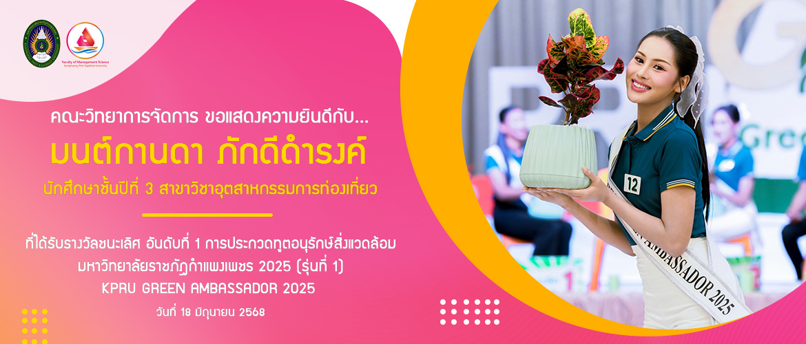 คณะวิทยาการจัดการ ขอแสดงความยินดีกับ…น้องมนต์กานดา ภักดีดำรงค์ นักศึกษาชั้นปีที่ 3 สาขาวิชาอุตสาหกรรมการท่องเที่ยว ที่ได้รับรางวัลชนะเลิศ อันดับที่ 1 การประกวดทูตอนุรักษ์สิ่งแวดล้อม มหาวิทยาลัยราชภัฎกำแพงเพชร 2025 (รุ่นที่ 1) KPRU GREEN AMBASSADOR 2025 เมื่อวันที่ 18 มิถุนายน 2568