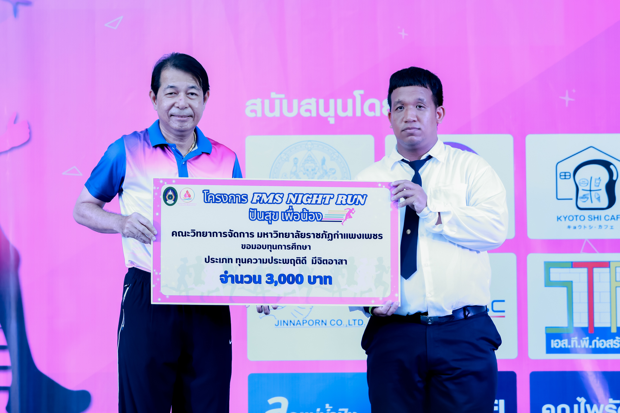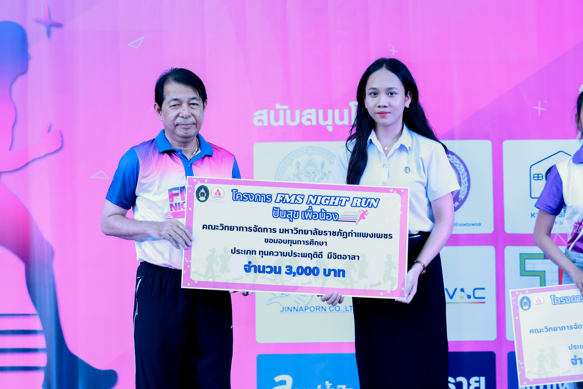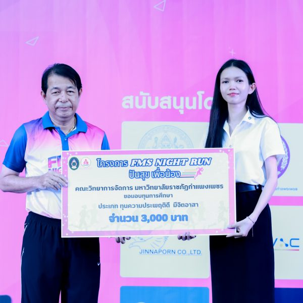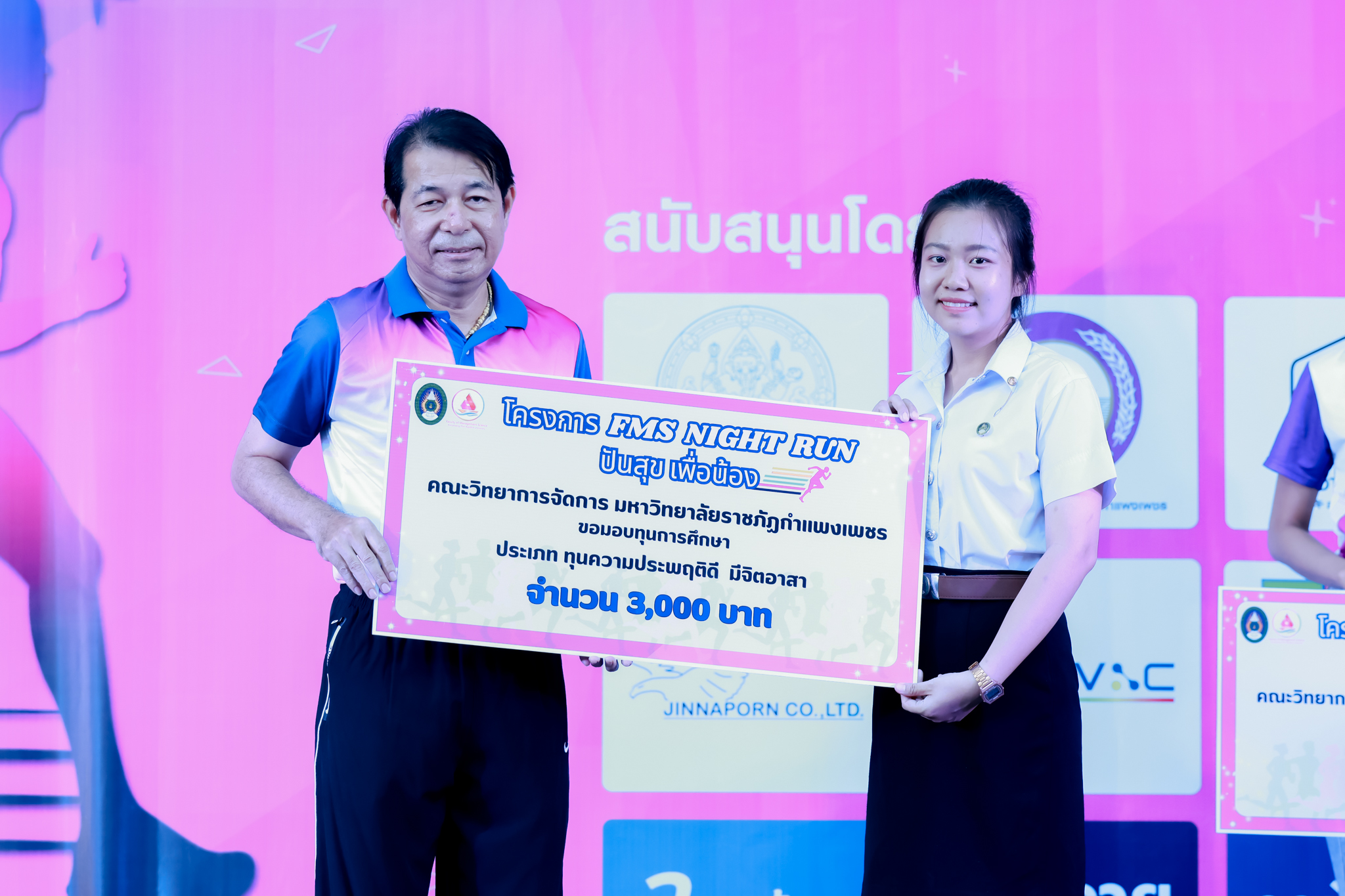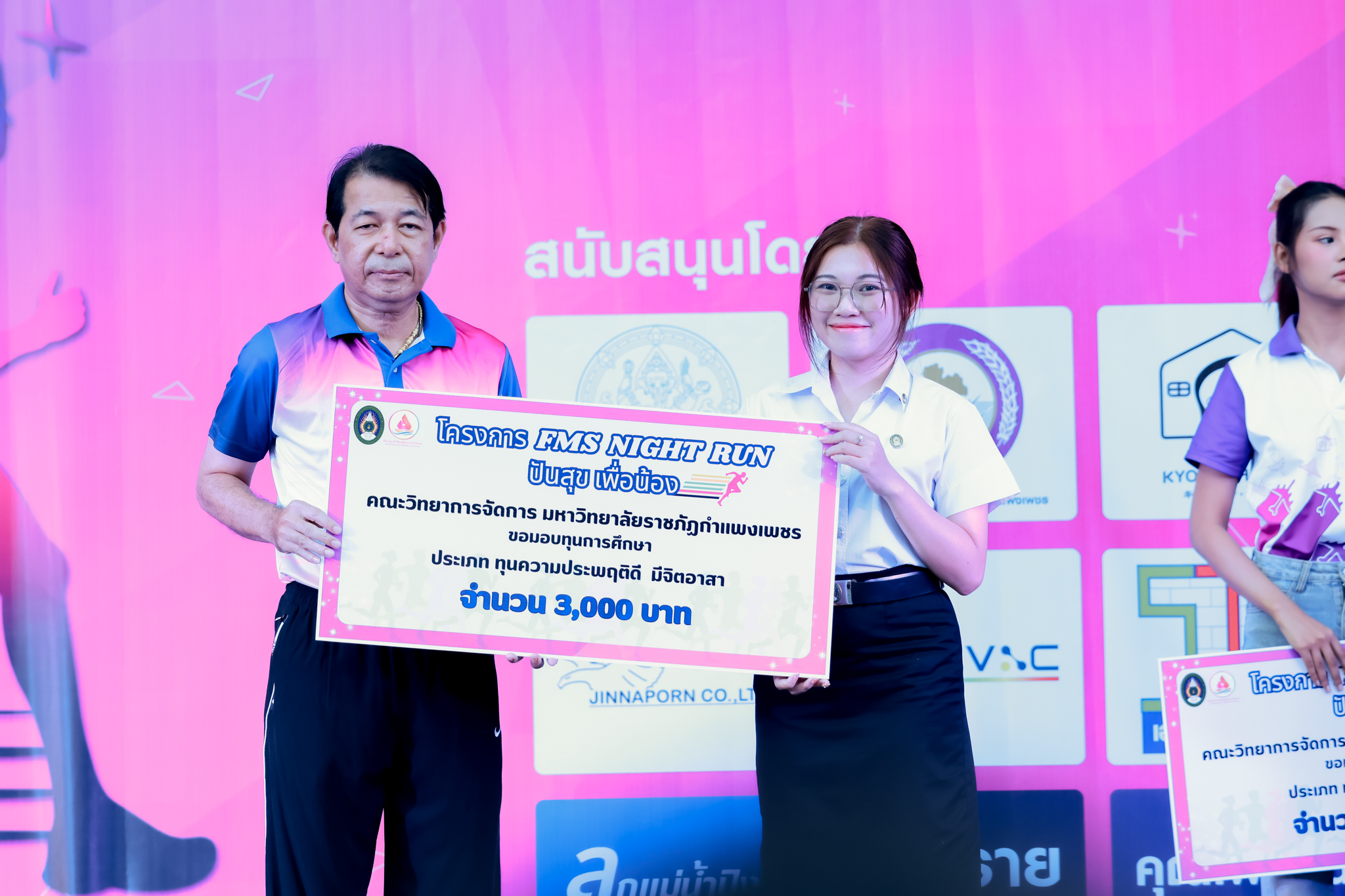 วันที่ 12 กรกฎาคม 2568 คณะวิทยาการจัดการ มหาวิทยาลัยราชภัฏกำแพงเพชร ได้จัดกิจกรรม “𝗙𝗠𝗦 𝗡𝗶𝗴𝗵𝘁 𝗥𝘂𝗻 ปันสุข เพื่อน้อง” โดยเป็นจัดการแข่งขันวิ่ง Fun Run ระยะทาง 5 กิโลเมตร ซึ่งกิจกรรมในครั้งนี้มีวัตถุประสงค์เพื่อให้นักศึกษา อาจารย์ บุคลากร ศิษย์เก่า และประชาชนทั่วไป ออกกำลังกายและมีสุขภาพแข็งแรงมากยิ่งขึ้น และเพื่อสนับสนุนและสร้างโอกาสทางการศึกษาหลังจากหักค่าใช้จ่ายโดยจัดสรรเป็นทุนการศึกษาของนักศึกษาคณะวิทยาการจัดการที่เรียนดี มีความประพฤติดีแต่ขาดทุนทรัพย์ ณ อุทยานประวัติศาสตร์กำแพงเพชร จังหวัดกำแพงเพชร