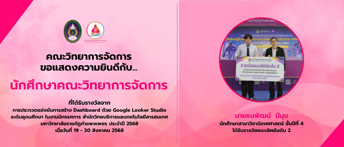 ขอแสดงความยินดีกับ…นักศึกษาคณะวิทยาการจัดการ ที่ได้รับรางวัลจากการประกวดแข่งขันการสร้าง Dashboard ด้วย Google Looker Studio ระดับอุดมศึกษา ในงานนิทรรศการ สำนักวิทยบริการและเทคโนโลยีสารสนเทศ มหาวิทยาลัยราชภัฏกำแพงเพชร ประจำปี 2568 เมื่อวันที่ 19 – 20 สิงหาคม 2568