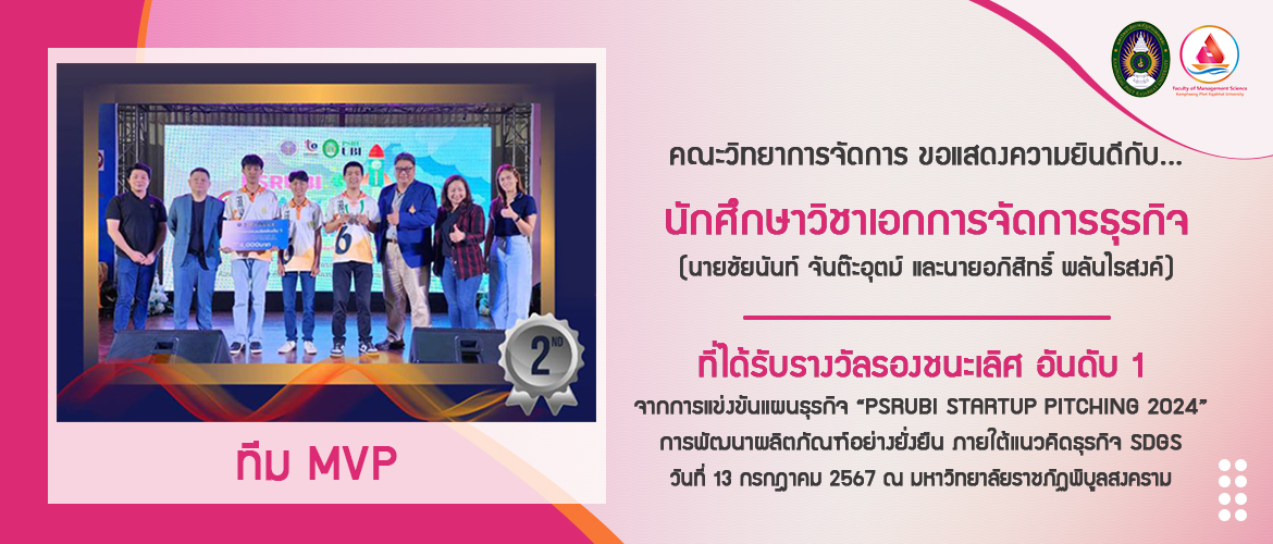 คณะวิทยาการจัดการ ขอแสดงความยินดีกับนักศึกษา ทีม MVP ที่ได้รับรางวัลรองชนะเลิศอันดับ 1 จากการแข่งขันการเขียนแผนธุรกิจ 𝗣𝗦𝗥𝗨𝗕𝗜 𝗦𝗧𝗔𝗥𝗧𝗨𝗣 𝗣𝗜𝗧𝗖𝗛𝗜𝗡𝗚 𝟮𝟬𝟮𝟰 การพัฒนาผลิตภัณฑ์อย่างยั่งยืน ภายใต้แนวคิดธุรกิจ SDGs ในวันเสาร์ที่ 13 กรกฎาคม 2567 ณ มหาวิทยาลัยราชภัฏพิบูลสงคราม ด้วยผลิตภัณฑ์ “ไซเดอร์จากน้ำอ้อยอินทรีย์” ซึ่งเป็นผลงานวิจัย : ผู้ช่วยศาสตราจารย์ ดร.เอนก หาลี สาขาวิชานวัตกรรมและธุรกิจอาหาร คณะวิทยาศาสตร์และเทคโนโลยี มหาวิทยาลัยราชภัฏกำแพงเพชร ซึ่งมีสมาชิกทีม ได้แก่ นายอมรวิชช์ อริยวิมล โปรแกรมวิชาอุตสาหกรรมศิลป์ คณะเทคโนโลยีอุตสาหกรรม มหาวิทยาลัยราชภัฏกำแพงเพชร นายชัยนันท์ จันต๊ะอุตม์ และนายอภิสิทธิ์ พลันไธสงค์ วิชาเอกการจัดการธุรกิจ คณะวิทยาการจัดการ มหาวิทยาลัยราชภัฏกำแพงเพชร โดยมีที่ปรึกษา ได้แก่ ผู้ช่วยศาสตราจารย์ ดร.เอนก หาลี ที่ปรึกษาด้านเทคโนโลยีอาหาร นายเอกพงษ์ เครือคำจิ๋ว ที่ปรึกษาด้านการเขียนแผนธุรกิจ และนางสาวพรอุมา ส้มแป้น ที่ปรึกษาด้านทรัพย์สินทางปัญญา