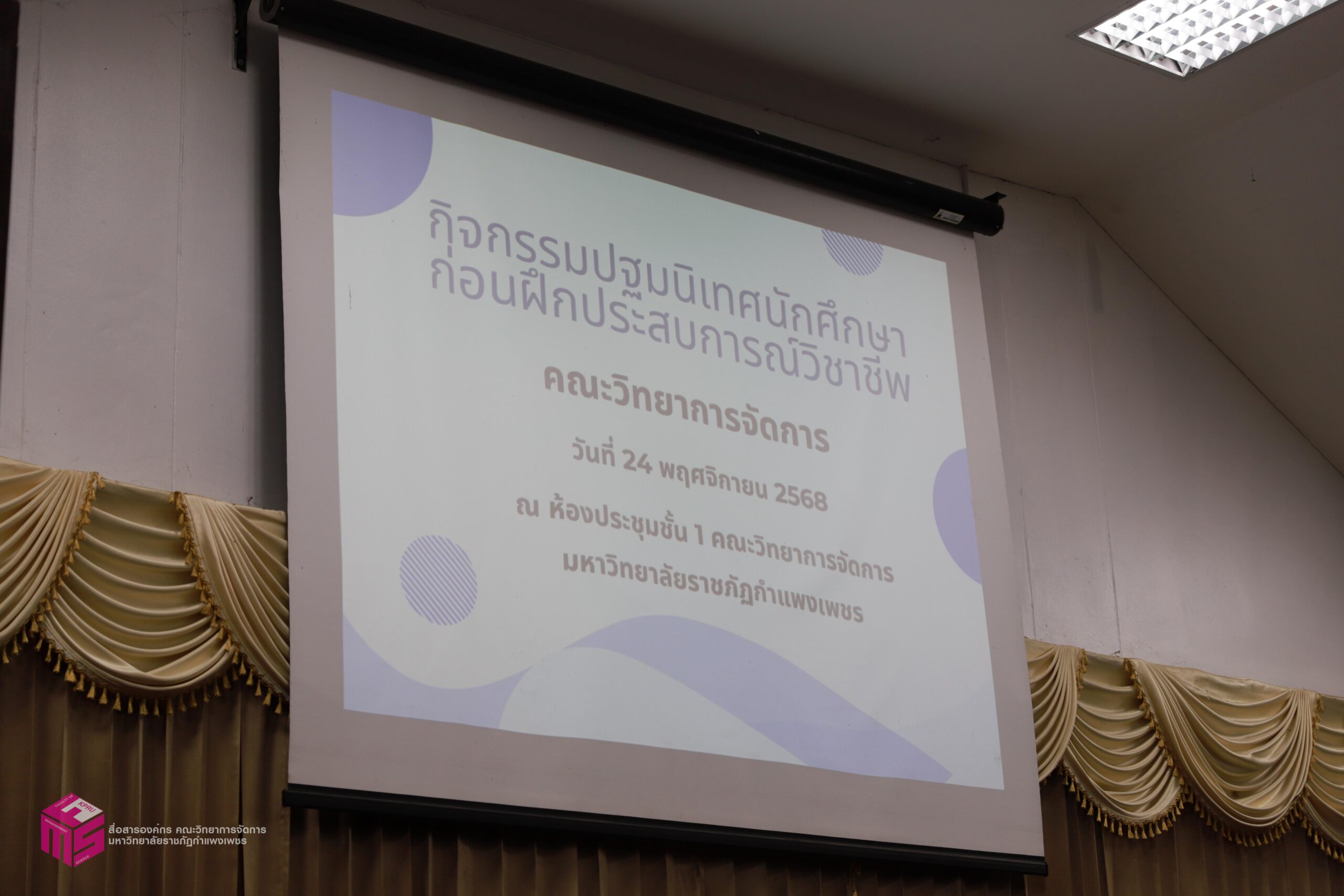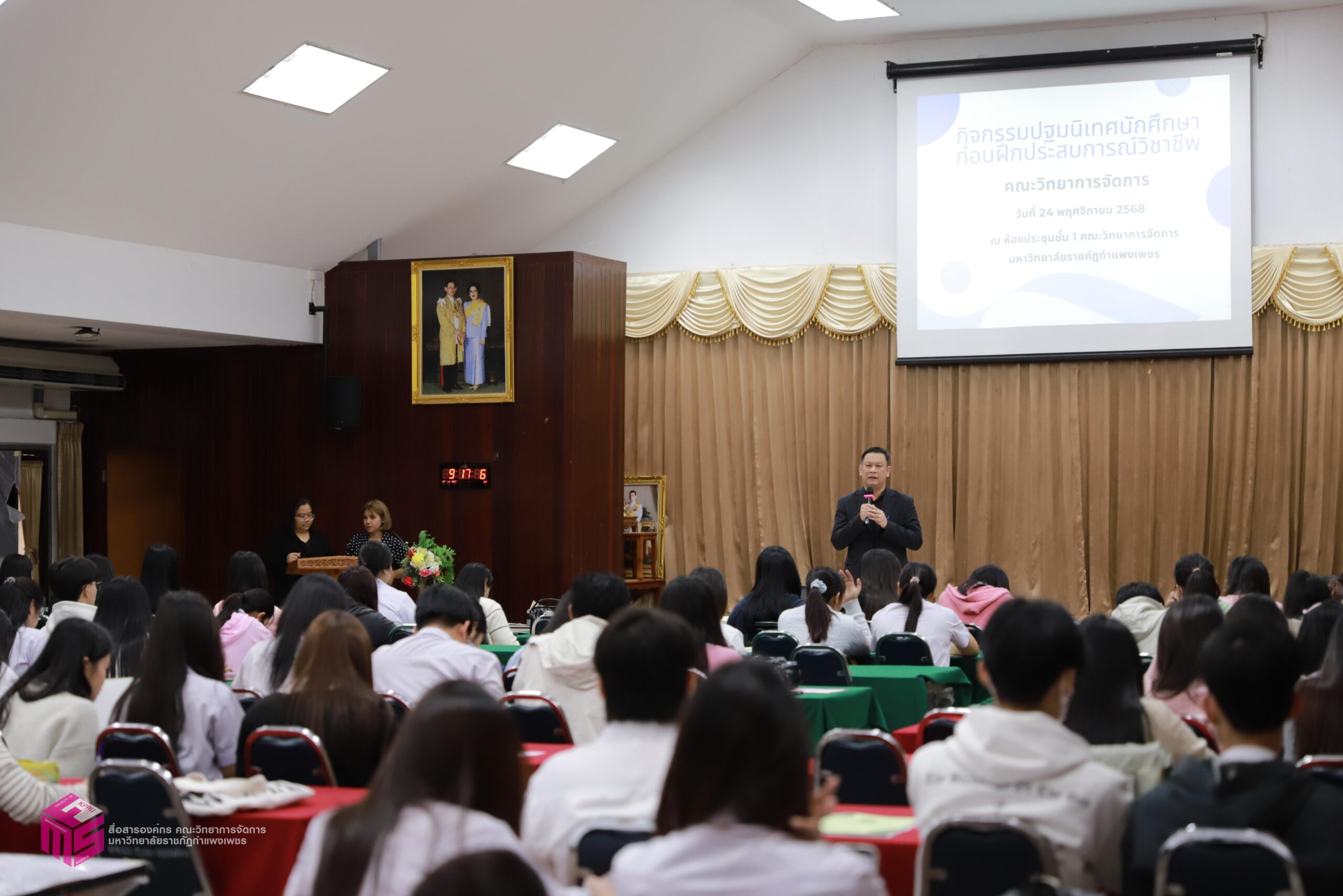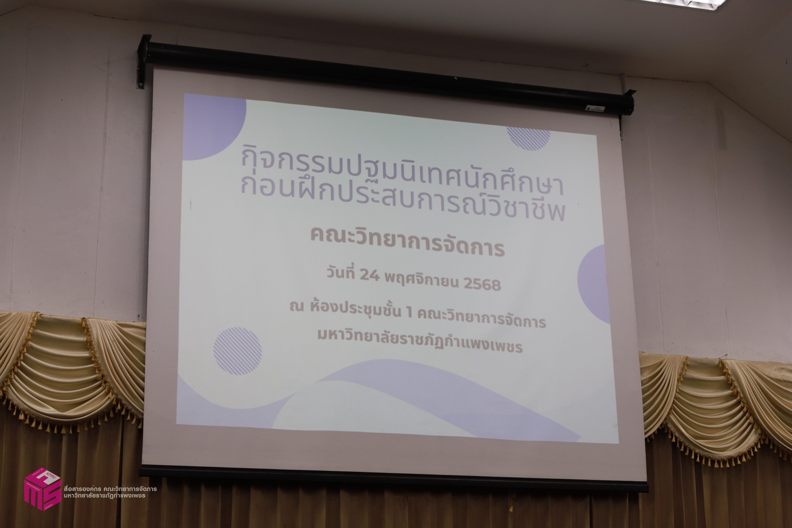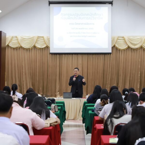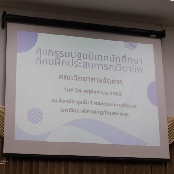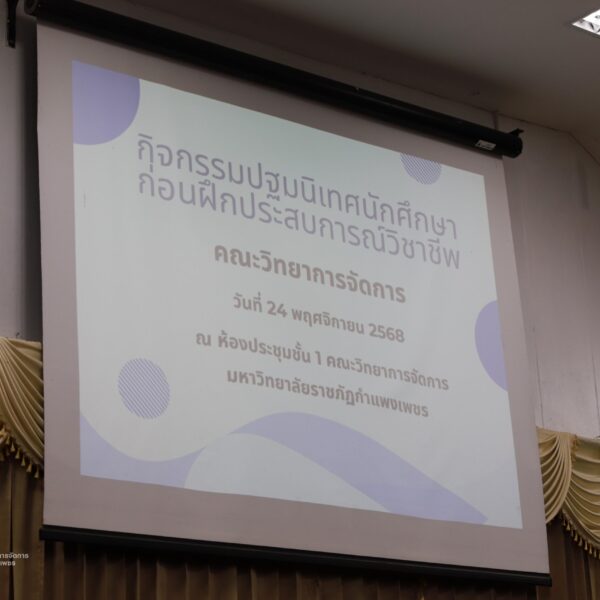 วันที่ 24 พฤศจิกายน 2568 ผู้ช่วยศาสตราจารย์การันต์ เจริญสุวรรณ คณบดีคณะวิทยาการจัดการ เป็นประธานในพิธีเปิดกิจกรรมปฐมนิเทศนักศึกษาก่อนฝุึกประสบการณ์วิชาชีพ เพื่อเตรียมความพร้อมก่อนการออกฝึกประสบการณ์วิชาชีพและการประกอบอาชีพเมื่อสำเร็จการศึกษา โดยมีอาจารย์ชลธิชา แสงงาม รองคณบดีฝ่ายกิจการนักศึกษาและศิลปวัฒนธรรม ชี้แจงเกี่ยวกับเอกสารก่อนออกฝึกงาน สร้างความเข้าใจในขั้นตอนการเขียนเอกสารฝึกงาน ณ ห้องประชุม ชั้น 1 คณะวิทยาการจัดการ มหาวิทยาลัยราชภัฏกำแพงเพชร