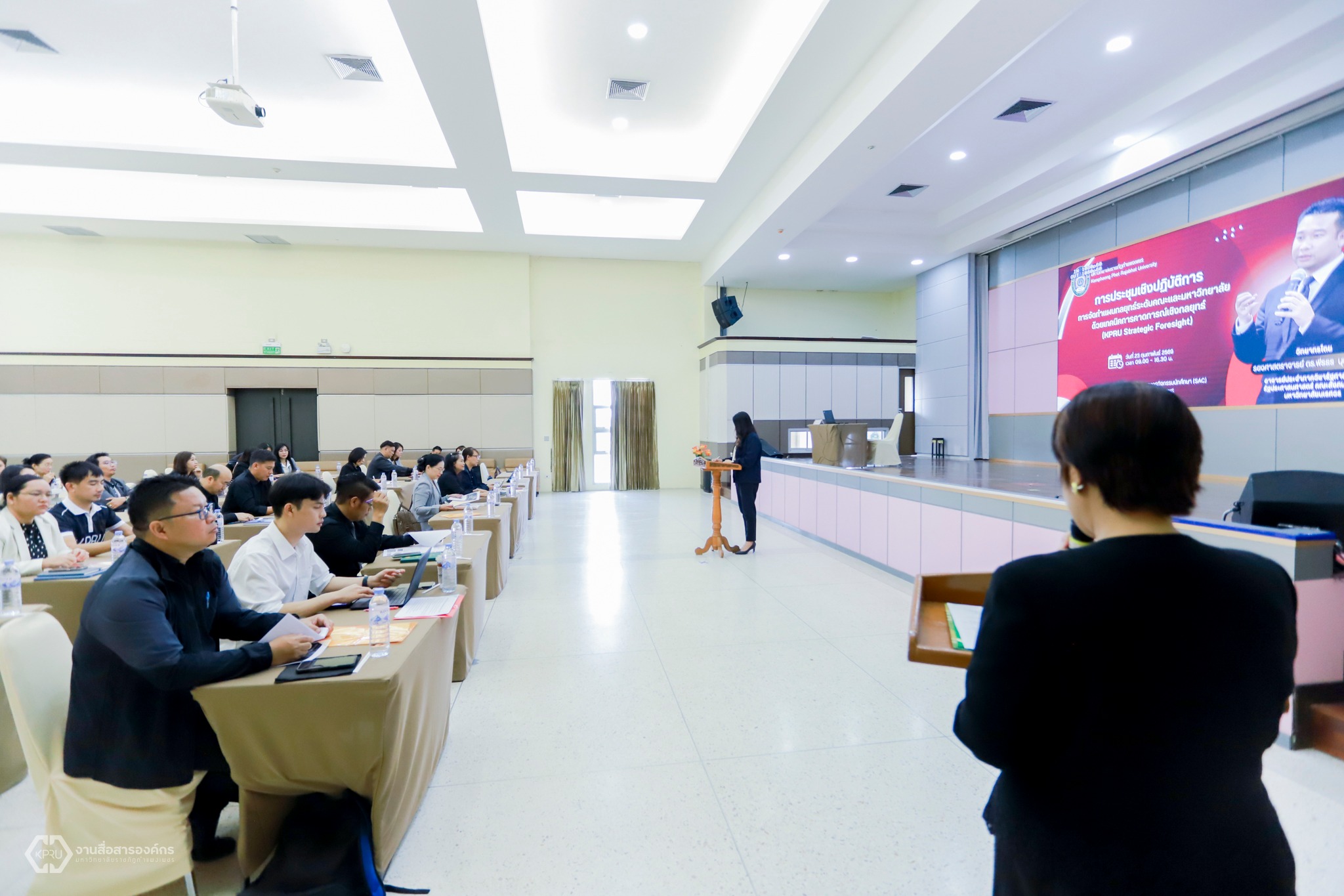 วันที่ 23 กุมภาพันธ์ 2569 ผู้ช่วยศาสตราจารย์ ดร.ปรียานุช พรหมภาสิต อธิการบดี เป็นประธานในการการประชุมเชิงปฏิบัติการ การจัดทำแผนกลยุทธ์ระดับคณะและมหาวิทยาลัย ด้วยเทคนิคการคาดการณ์เชิงกลยุทธ์ (KPRU Strategic Foresight) จัดโดยกองนโยบายและแผน สำนักงานอธิการบดี โดยมีคณะผู้บริหาร อาจารย์ และบุคลากร เข้าร่วมการประชุมฯ ณ ห้องประชุมสุพรรณิการ์ ชั้น 3 อาคารกิจกรรมนักศึกษา (SAC)