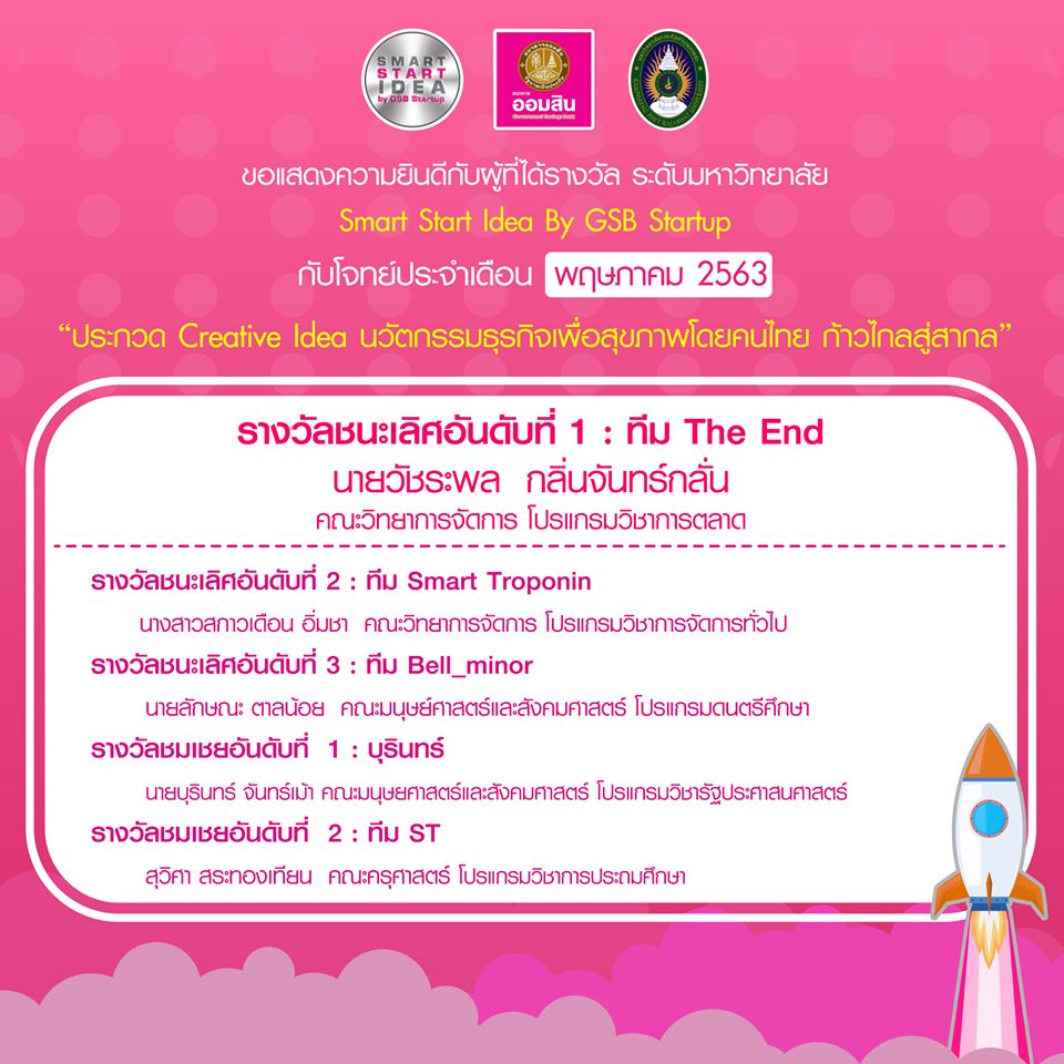 ขอแสดงความยินดีกับ…ตัวแทนนักศึกษาคณะวิทยาการจัดการ มหาวิทยาลัยราชภัฏกำแพงเพชร ที่ได้รับรางวัลจากการประกวดโจทย์ ท้าประลอง Idea WoW ประจำเดือนพฤษภาคม 2563 “กิจกรรม ประกวด Idea สร้างสรรค์ Smart Start Idea by GSB Startup ภายใต้โจทย์ “Creative Idea นวัตกรรมธุรกิจเพื่อสุขภาพโดยคนไทย ก้าวไกลสู่สากล” โดยธนาคารออมสิน ร่วมกับมหาวิทยาลัยราชภัฏกำ