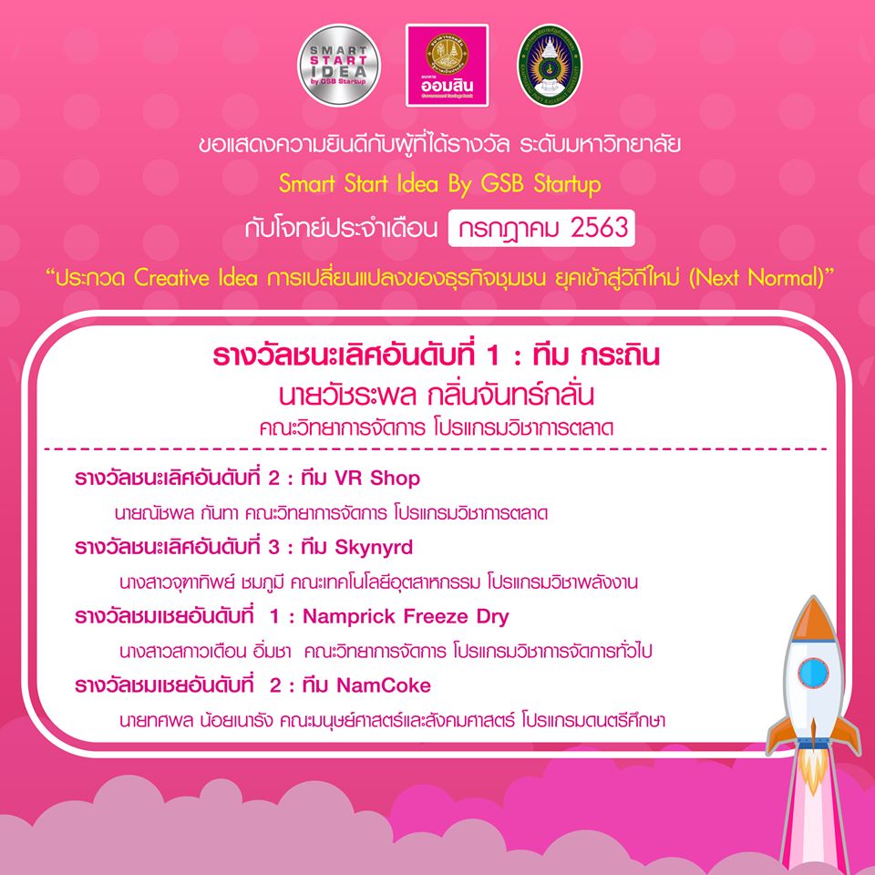 ขอแสดงความยินดีกับ…ตัวแทนนักศึกษาคณะวิทยาการจัดการ มหาวิทยาลัยราชภัฏกำแพงเพชร ที่ได้รับรางวัลจากการประกวดโจทย์ ท้าประลอง Idea WoW ประจำเดือนกรกฎาคม 2563 “กิจกรรม ประกวด Idea สร้างสรรค์ Smart Start Idea by GSB Startup ภายใต้โจทย์ “Creative Idea การเปลี่ยนแปลงของธุรกิจชุมชน ยุคเข้าสู่วิถีใหม่ (Next Normal)” โดยธนาคารออมสิน ร่วมกับมหาวิทยาลัยราชภัฏกำ