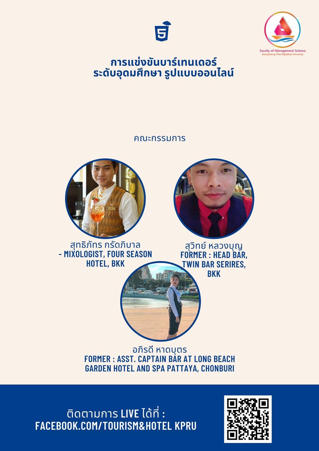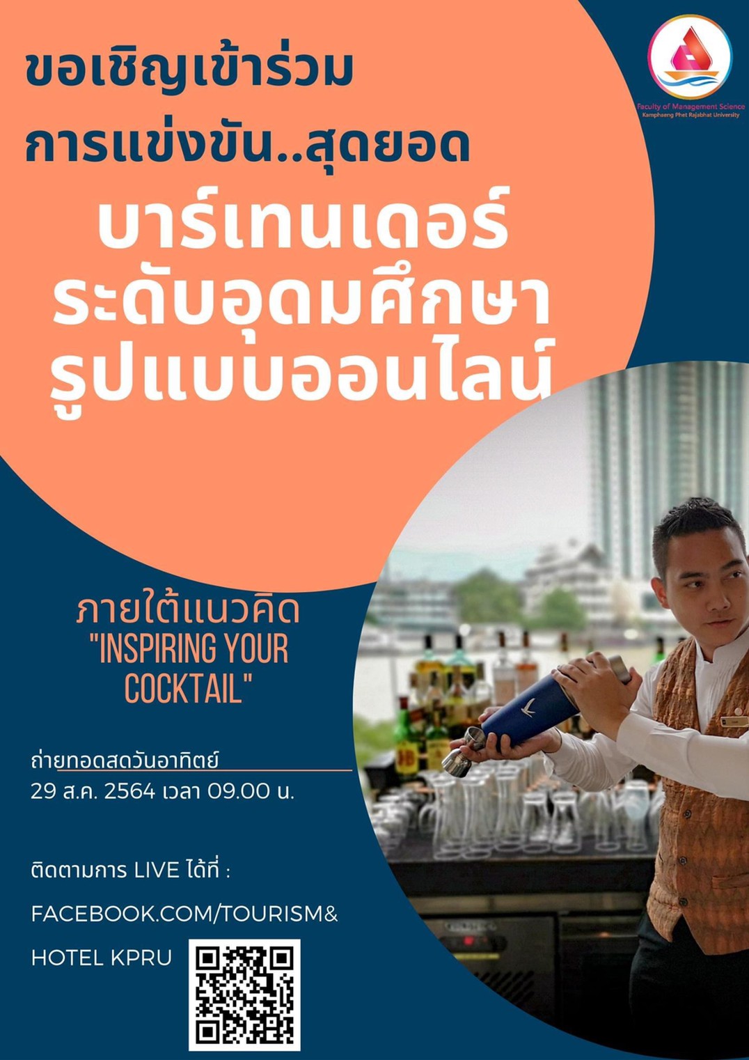 วันที่ 28-29 สิงหาคม 2564 เวลา 08.00 น. เป็นต้นไป โปรแกรมวิชาการท่องเที่ยวและการโรงแรม คณะวิทยาการจัดการ มหาวิทยาลัยราชภัฏกำแพงเพชร ได้ดำเนินการจัดกิจกรรมการแข่งขันทักษะวิชาชีพด้านบาร์เทนเดอร์และการครัว ในหัวข้อ “ดื่ม กิน เที่ยวเมืองกำแพงเพชร” ผ่านระบบออนไลน์ (MS-teams) ให้กับนักศึกษาโปรแกรมวิชาการท่องเที่ยวและการโรงแรม จำนวน 94 คน เพื่อให้นักศึกษาได้แสดงออกด้านความสามารถและฝึกฝนทักษะวิชาชีพด้านการโรงแรมและการครัว โดยมี อ.ประพล จิตคติ เป็นผู้ดูแลรับผิดชอบกิจกรรม