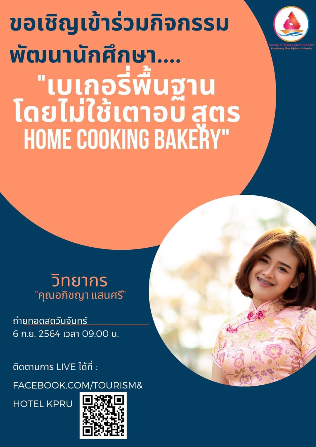วันที่ 6 กันยายน 2564 เวลา 09.00 น. เป็นต้นไป โปรแกรมวิชาการท่องเที่ยวและการโรงแรม คณะวิทยาการจัดการ มหาวิทยาลัยราชภัฏกำแพงเพชร ได้ดำเนินการจัดอบรม เรื่อง เบเกอรี่พื้นฐานโดยไม่ใช้เตาอบสูตร Home Cooking Bakery โดยมีคุณอภิชญา แสนศรี เป็นวิทยากรให้ความรู้กับนักศึกษาโปรแกรมวิชาการท่องเที่ยวและการโรงแรม ชั้นปีที่ 1 – 3 จํานวน 68 คน เพี่อสร้างทักษะ และเป็นการบูรณาการกับรายวิชา การจัดการอาหารไทย การตลาดการท่องเที่ยวและการโรงแรม และวิชาอุตสาหกรรมการท่องเที่ยว ซึ่งใช้รูปแบบการเข้าร่วมกิจกรรมผ่านระบบออนไลน์ Zoom และ Live Streaming ผ่าน Tourism&hotel KPRU โดยมีนายประพล จิตคติ เป็นผู้ดูแลรับผิดชอบกิจกรรม