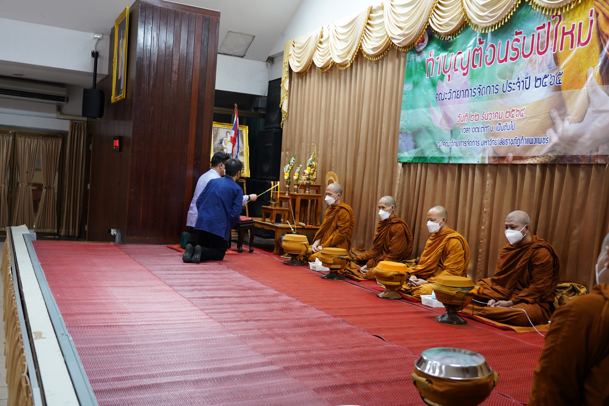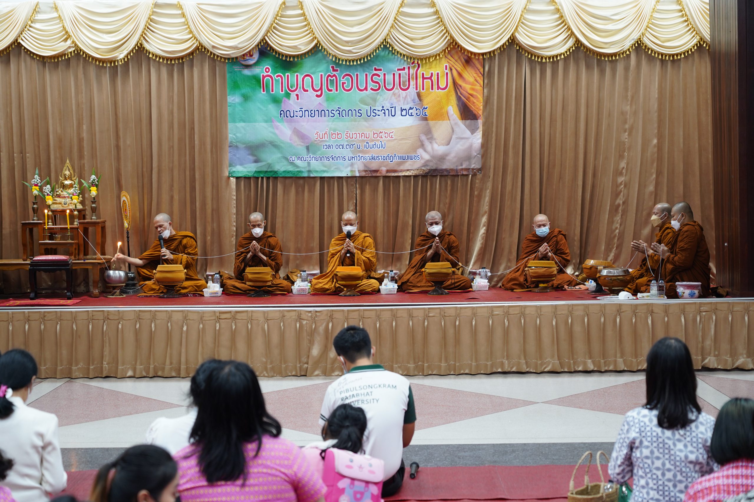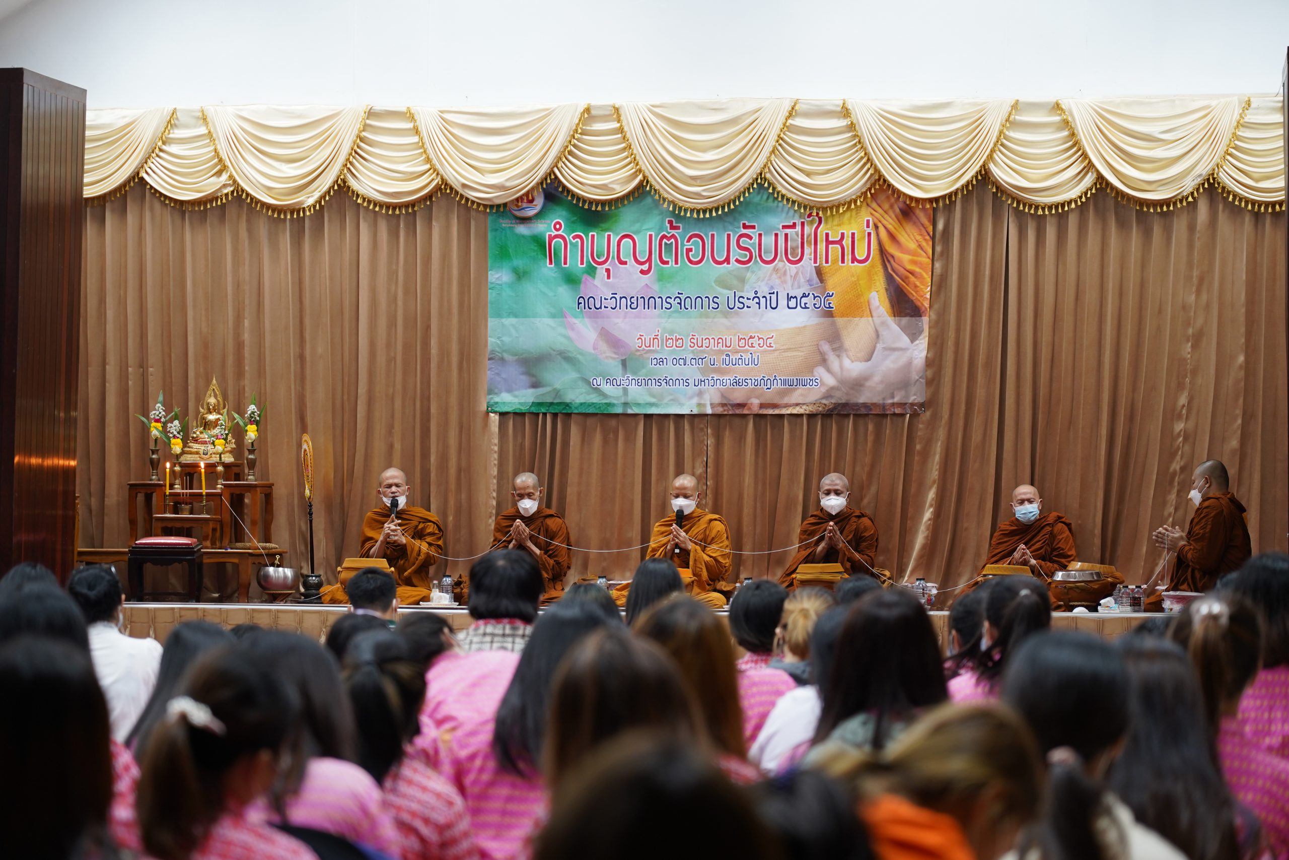วันที่ 22 ธันวาคม 2564 เวลา 07.00 น.เป็นต้นไป คณาจารย์ เจ้าหน้าที่ และนักศึกษาคณะวิทยาการจัดการ มหาวิทยาลัยราชภัฏกำแพงเพชร เข้าร่วมกิจกรรมทำบุญ และสังสรรค์ปีใหม่ คณะวิทยาการจัดการ ประจำปี 2565 เพื่อเป็นการส่งเสริมศิลปวัฒนธรรม ประเพณีไทยอันดีงามสืบไป ซึ่งภายในงานประกอบด้วย กิจกรรมพิธีไหว้ศาล กิจกรรมทำบุญ และกิจกรรมสังสรรค์ปีใหม่ คณะวิทยาการจัดการ ณ ห้องประชุม ชั้น 1 และห้องภัตตาคาร คณะวิทยาการจัดการ มหาวิทยาลัยราชภัฏกำแพงเพชร