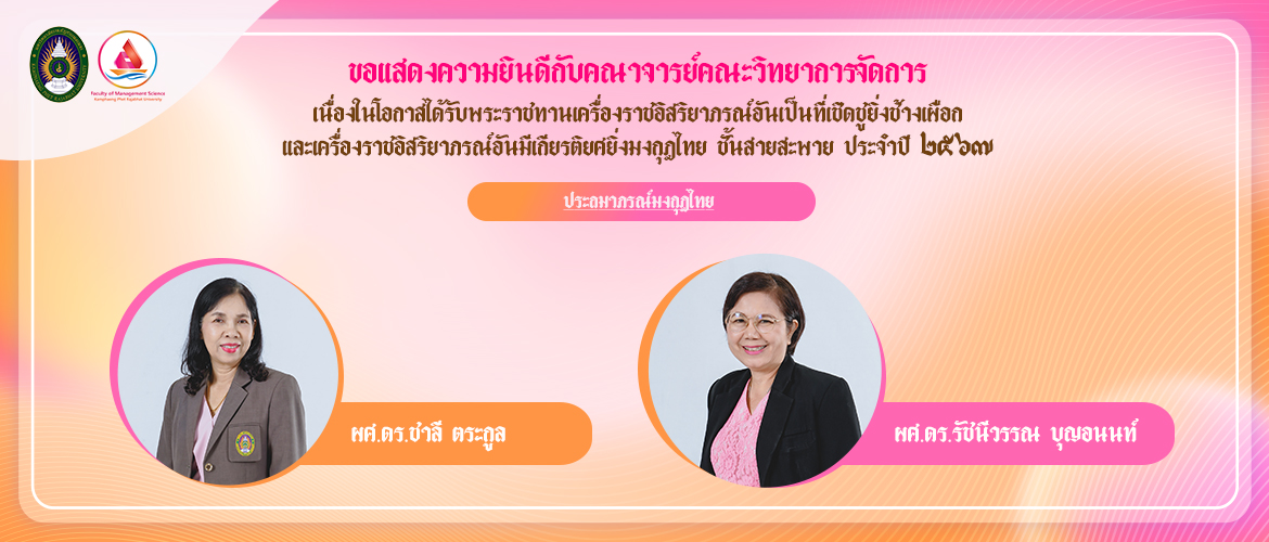 ขอแสดงความยินดีกับคณาจารย์คณะวิทยาการจัดการ เนื่องในโอกาสได้รับพระราชทานเครื่องราชอิสริยาภรณ์อันเป็นที่เชิดชูยิ่งช้างเผือกและเครื่องราชอิสริยาภรณ์อันมีเกียรติยศยิ่งมงกุฎไทย ชั้นสายสะพาย ประจำปี ๒๕๖๗ ประถมาภรณ์มงกุฎไทย ได้แก่ ผู้ช่วยศาสตราจารย์ ดร.ชาลี ตระกูล และผู้ช่วยศาสตราจารย์ ดร.รัชนีวรรณ บุญอนนท์