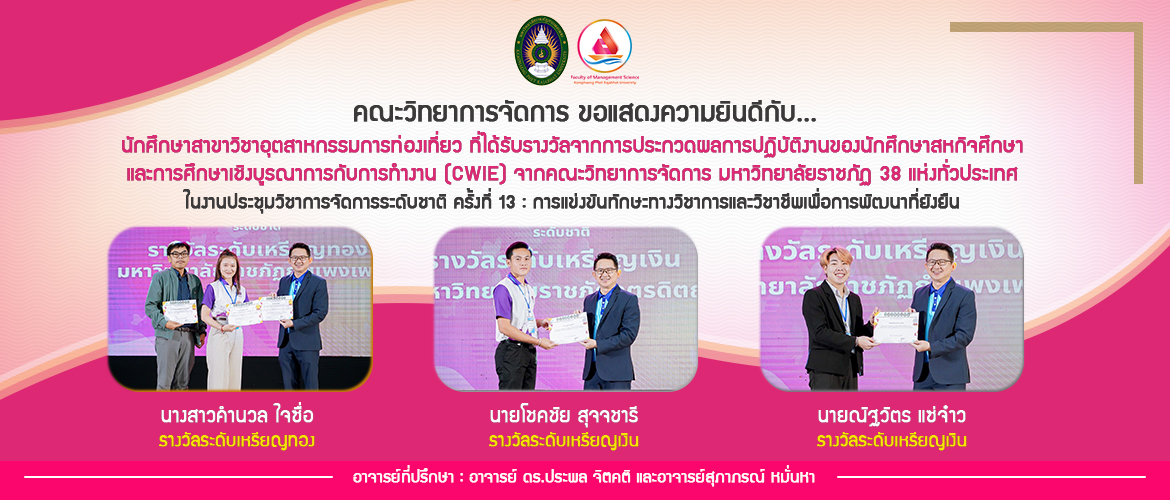 คณะวิทยาการจัดการ ขอแสดงความยินดีกับ….นักศึกษาสาขาวิชาอุตสาหกรรมการท่องเที่ยว ที่ได้รับรางวัลจากการประกวดผลการปฏิบัติงานของนักศึกษาสหกิจศึกษาและการศึกษาเชิงบูรณาการกับการทำงาน (CWIE) จากคณะวิทยาการจัดการ มหาวิทยาลัยราชภัฏ 38 แห่งทั่วประเทศ ในงานประชุมวิชาการจัดการระดับชาติ ครั้งที่ 13: การแข่งขันทักษะทางวิชาการและวิชาชีพเพื่อการพัฒนาที่ยังยืน วันที่ 28 มิถุนายน 2567 ณ ห้องประชุม ชั้น 15 อาคาร 90 ปี ราชภัฏเชียงใหม่ มหาวิทยาลัยราชภัฏเชียงใหม่ โดยได้รับรางวัล ดังนี้