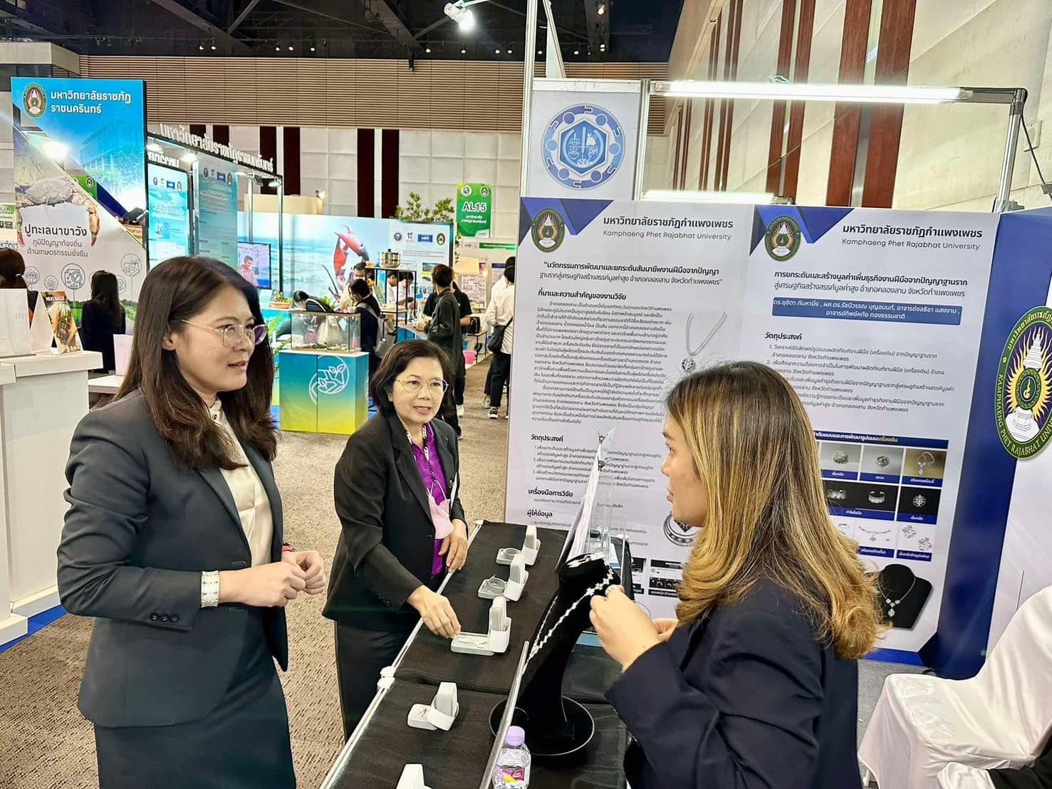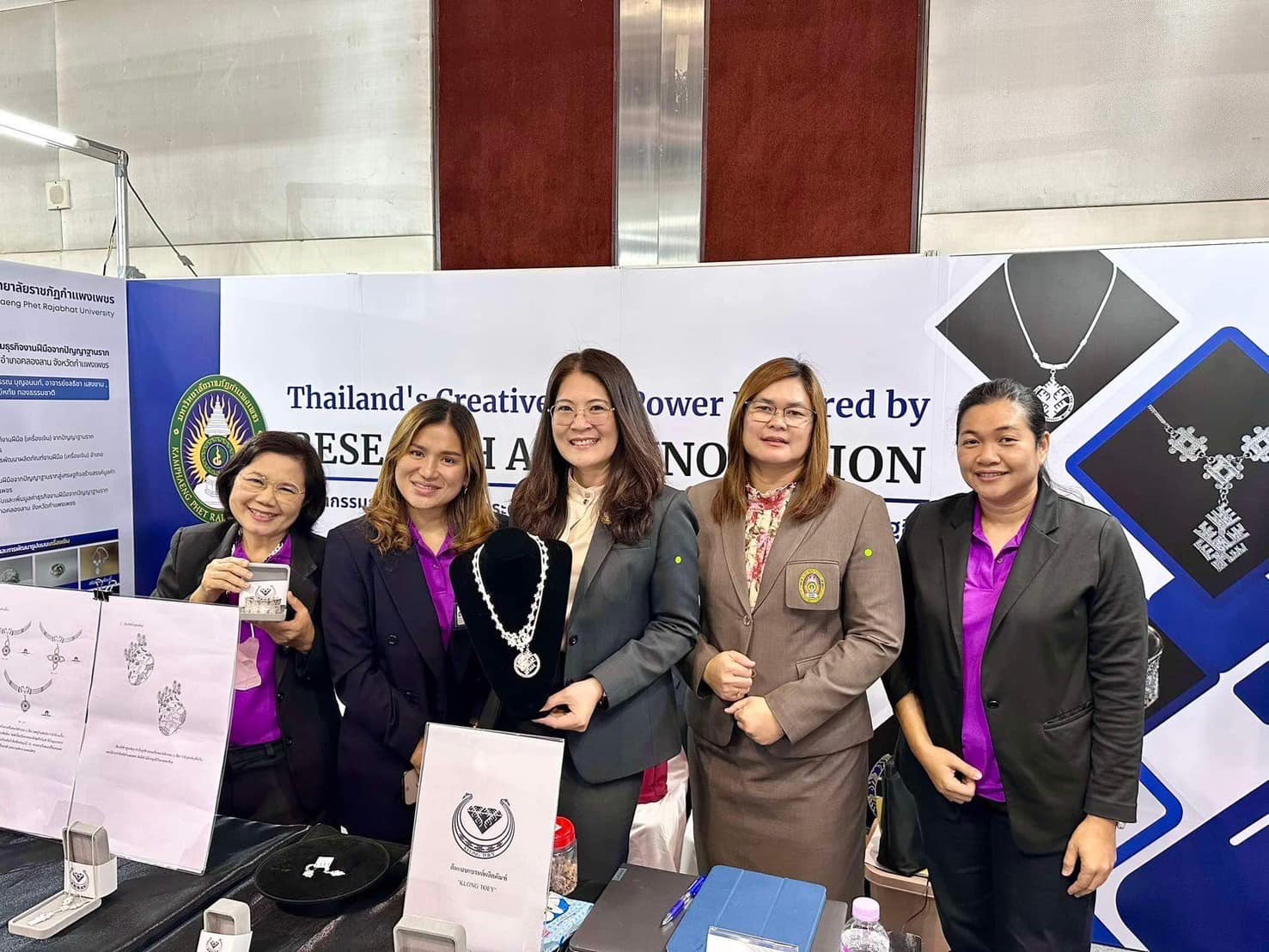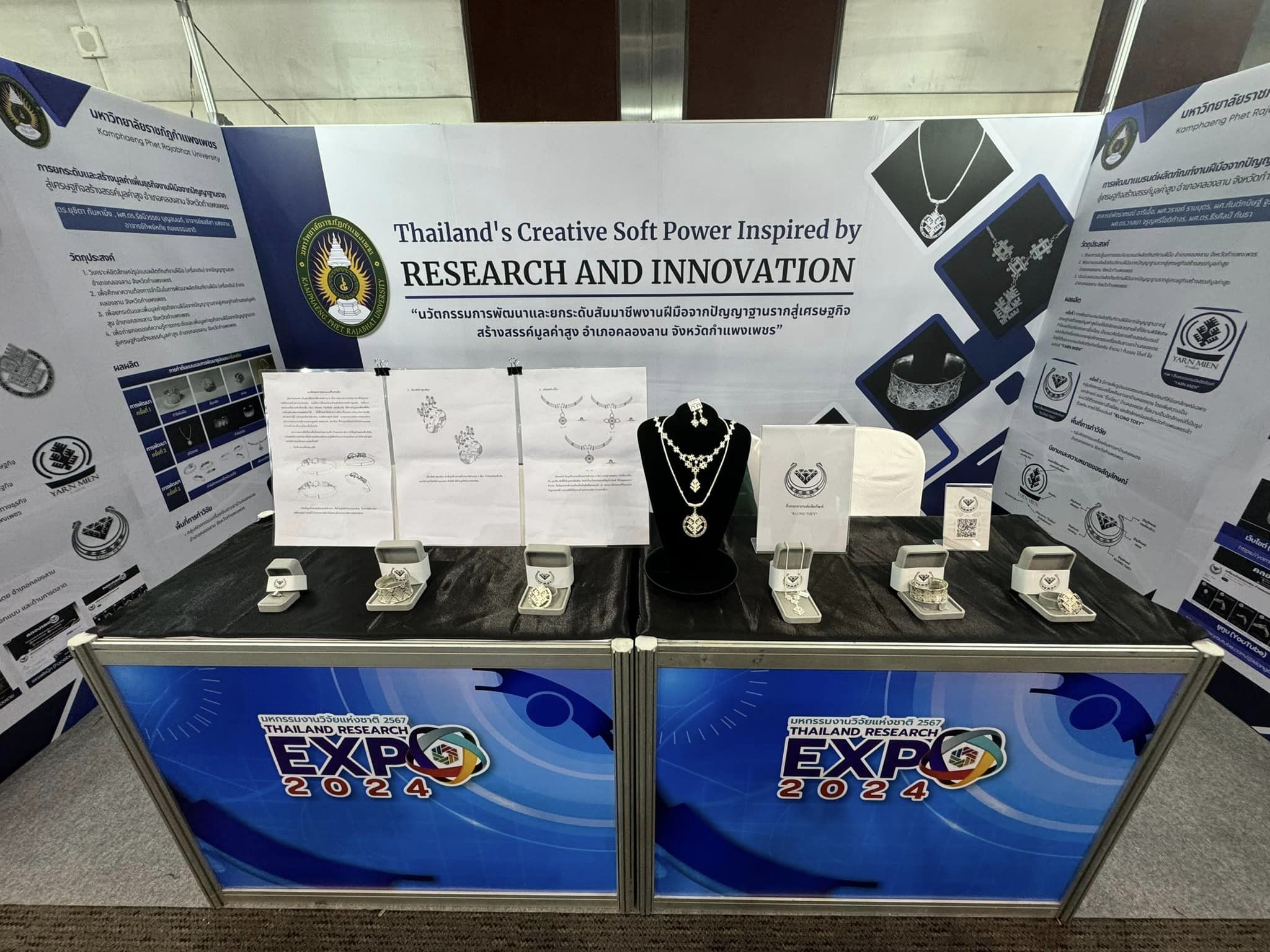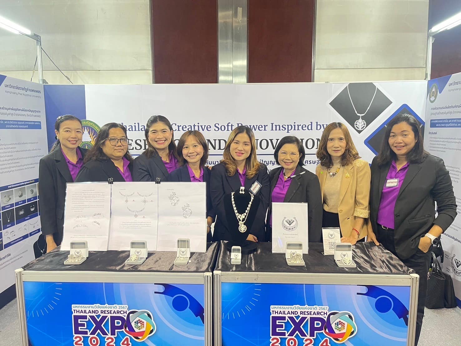 วันที่ 26 – 30 สิงหาคม 2567 ทีมผู้วิจัยของคณะวิทยาการจัดการ มหาวิทยาลัยราชภัฏกำแพงเพชร และมหาวิทยาลัยราชภัฏกำแพงเพชร แม่สอด ได้นำผลงานวิจัยเข้าร่วมจัดแสดงนิทรรศการงานมหกรรมงานวิจัยแห่งชาติ 2567 (Thailand Research Expo 2024) ประเภทงานวิจัยและนวัตกรรมเพื่อสร้างพลังสร้างสรรค์ Soft Power ของประเทศ ในชุดโครงการ “นวัตกรรมการพัฒนาและยกระดับสัมมาชีพงานฝีมือจากปัญญาฐานรากสู่เศรษฐกิจสร้างสรรค์มูลค่าสูง อำเภอคลองลาน จังหวัดกำแพงเพชร” ณ โรงแรมเซ็นทาราแกรนด์และบางกอกคอนเวนชันเซ็นเตอร์เซ็นทรัลเวิลด์ กรุงเทพฯ ซึ่งประกอบไปด้วย 3 โครงการย่อย ได้แก่ การยกระดับและสร้างมูลค่าเพิ่มธุรกิจงานฝีมือจากปัญญาฐานรากสู่เศรษฐกิจสร้างสรรค์มูลค่าสูง อำเภอคลองลาน จังหวัดกำแพงเพชร ผู้วิจัย ได้แก่ ดร.ยุชิตา กันหามิ่ง , ผู้ช่วยศาสตราจารย์ ดร.รัชนีวรรณ บุญอนนท์ , อาจารย์ชลธิชา แสงงาม , อาจารย์ทิพย์หทัย ทองธรรมชาติ การพัฒนาแบรนด์ผลิตภัณฑ์งานฝีมือจากปัญญาฐานรากสู่เศรษฐกิจสร้างสรรค์มูลค่าสูง อำเภอคลองลาน จังหวัดกำแพงเพชร ผู้วิจัยได้แก่ อาจารย์พัตราภรณ์ อารีเอื้อ, ผู้ช่วยศาสตราจารย์วรางค์ รามบุตร, ผู้ช่วยศาสตราจารย์กันต์กนิษฐ์ จูรัตน์, ผู้ช่วยศาสตราจารย์ ดร.วาสนา จรูญศรีโชติกำจร, ผู้ช่วยศาสตราจารย์ ดร.ธีรศิลป์ กันธาร นวัตกรรมแผนธุรกิจและการตลาดดิจิทัลเพื่อเพิ่มโอกาสทางธุรกิจของงานฝีมือจากปัญญาฐานราก อำเภอคลองลาน จังหวัดกำแพงเพชร ผู้วิจัยได้แก่ ผู้ช่วยศาสตราจารย์ ดร.กนิษฐา ศรีภิรมย์, ผู้ช่วยศาสตราจารย์ ดร.วาสนา จรูญศรีโชติกำจร, ดร.ประภัสสร กลีบประทุม
