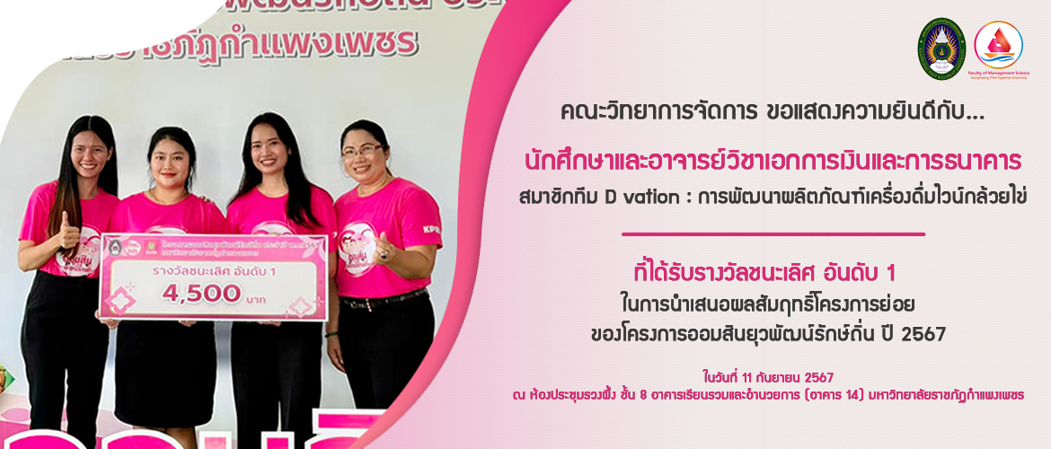คณะวิทยาการจัดการ มหาวิทยาลัยราชภัฏกำแพงเพชรขอแสดงความยินดีกับ…นักศึกษาและอาจารย์วิชาเอกการเงินและการธนาคาร สมาชิกทีม D vation : การพัฒนาผลิตภัณฑ์เครื่องดื่มไวน์กล้วยไข่ ที่ได้รับรางวัลชนะเลิศ อันดับ 1 ในการนำเสนอผลสัมฤทธิ์โครงการย่อยของโครงการออมสินยุวพัฒน์รักษ์ถิ่น ปี 2567 ในวันที่ 11 กันยายน 2567ณ ห้องประชุมรวงผึ้ง ชั้น 8 อาคารเรียนรวมและอำนวยการ (อาคาร 14) มหาวิทยาลัยราชภัฏกำแพงเพชร