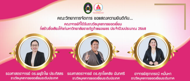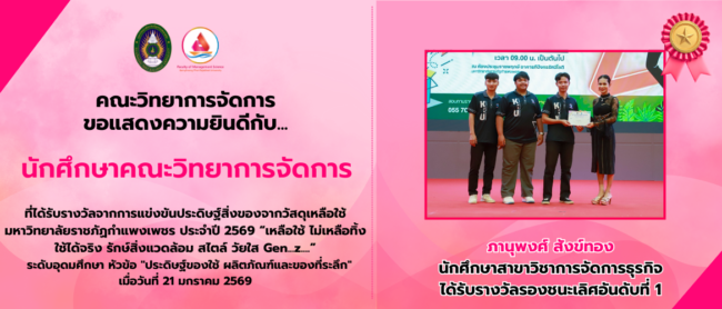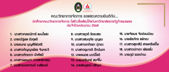 คณะวิทยาการจัดการ ขอแสดงความยินดีกับ…นักศึกษาคณะวิทยาการจัดการ ที่สร้างชื่อเสียงให้แก่มหาวิทยาลัยราชภัฏกำแพงเพชร ประจำปีงบประมาณ 2568