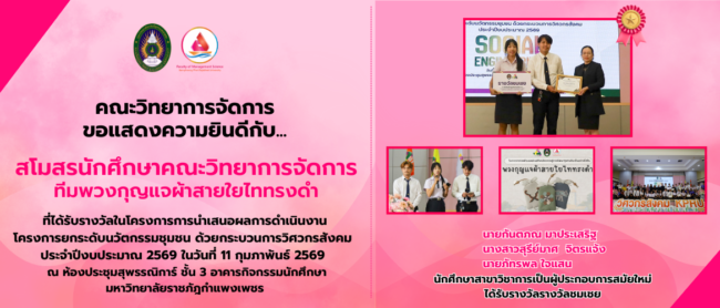 คณะวิทยาการจัดการ ขอแสดงความยินดีกับ… สโมสรนักศึกษาคณะวิทยาการจัดการ ทีมพวงกุญแจผ้าสายใยไททรงดำ นายกันตภณ มาประเสริฐ นางสาวสุรีย์มาศ จิตรแจ้ง นายภัทรพล ใจแสน นักศึกษาสาขาวิชาการเป็นผู้ประกอบการสมัยใหม่ ที่ได้รับรางวัลรางวัลชมเชย ในโครงการการนำเสนอผลการดำเนินงาน โครงการยกระดับนวัตกรรมชุมชน ด้วยกระบวนการวิศวกรสังคม ประจำปีงบประมาณ 2569 ในวันที่ 11 กุมภาพันธ์ 2569 ณ ห้องประชุมสุพรรณิการ์ ชั้น 3 อาคารกิจกรรมนักศึกษา มหาวิทยาลัยราชภัฎกำแพงเพชร