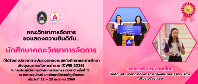 คณะวิทยาการจัดการ ขอแสดงความยินดีกับ… นางสาวพิยดา น้อยเอี่ยม นักศึกษาสาขาวิชาการจัดการการท่องเที่ยวและธุรกิจบริการ ได้รับรางวัลชมเชย จากการประกวดผลงานสหกิจศึกษาและการศึกษาเชิงบูรณาการกับการทำงาน (CWIE 2026) ในการประชุมวิชาการวิทยาการจัดการระดับชาติ ครั้งที่ 15 ณ หอประชุมใหญ่ มหาวิทยาลัยราชภัฏเชียงราย เมื่อวันที่ 22 – 23 มกราคม 2569