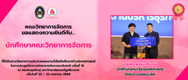 คณะวิทยาการจัดการ ขอแสดงความยินดีกับ… นายพีระพงษ์ ปรีเปรม นักศึกษาสาขาวิชานิเทศศาสตร์ ที่ได้รับรางวัลชนะเลิศ จากการประกวดผลงานวิจัยนักศึกษาด้านนิเทศศาสตร์ ในการประชุมวิชาการวิทยาการจัดการระดับชาติ ครั้งที่ 15 ณ หอประชุมใหญ่ มหาวิทยาลัยราชภัฏเชียงราย เมื่อวันที่ 22 – 23 มกราคม 2569