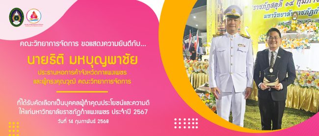 คณะวิทยาการจัดการ ขอแสดงความยินดีกับ…นายธิติ มหบุญพาชัย ประธานหอการค้าจังวัดกำแพงเพชร และผู้ทรงคุณวุฒิ คณะวิทยาการจัดการ ที่ได้รับคัดเลือกเป็นบุคคลผู้ทำคุณประโยชน์และความดีให้แก่มหาวิทยาลัยราชภัฏกำแพงเพชร ประจำปี พ.ศ. 2567 ในงานพิธีอัญเชิญตราพระราชลัญจกร พิธีรำลึกวันราชภัฏ ประจำปี 2568 ในวันที่ 14 กุมภาพันธ์ 2568 ณ สนามกีฬากลางแจ้ง มหาวิทยาลัยราชภัฏกำแพงเพชร