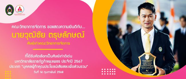 คณะวิทยาการจัดการ ขอแสดงความยินดีกับ…นายวุฒิชัย ตรุษลักษณ์ ศิษย์เก่าคณะวิทยาการจัดการ ที่ได้รับคัดเลือกเป็นศิษย์เก่าดีเด่น มหาวิทยาลัยราชภัฏกำแพงเพชร ประจำปี 2567 ประเภท “บุคคลผู้ทำคุณประโยชน์เสียสละเพื่อส่วนรวม” ในงานพิธีอัญเชิญตราพระราชลัญจกร พิธีรำลึกวันราชภัฏ ประจำปี 2568 ในวันที่ 14 กุมภาพันธ์ 2568 ณ สนามกีฬากลางแจ้ง มหาวิทยาลัยราชภัฏกำแพงเพชร