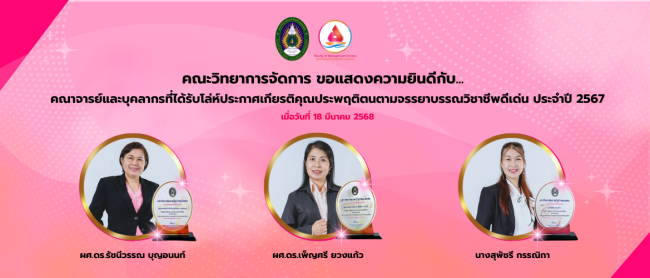 คณะวิทยาการจัดการ ขอแสดงความยินดีกับ…คณาจารย์ และบุคลากรที่ได้รับโล่ห์ประกาศเกียรติคุณ ประพฤติตนตามจรรยาบรรณวิชาชีพดีเด่น ประจำปี 2567 ได้แก่ ผู้ช่วยศาสตราจารย์ ดร.รัชนีวรรณ บุญอนนท์ อาจารย์ประจำสาขาวิชาอุตสาหกรรมการท่องเที่ยว ผู้ช่วยศาสตราจารย์ ดร.เพ็ญศรี ยวงแก้ว อาจารย์ประจำวิชาเอกการจัดการธุรกิจ และนางสุพัชรี กรรณิกา เจ้าหน้าที่บริหารงานทั่วไป