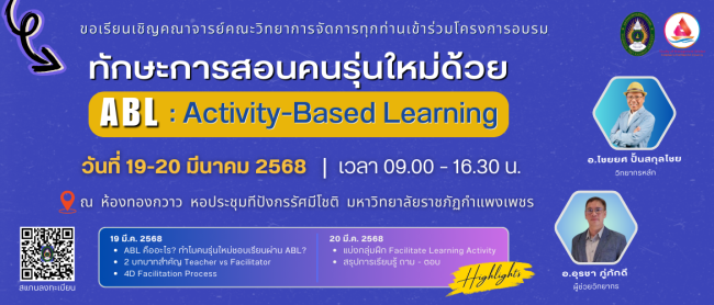 ขออนุญาตประชาสัมพันธ์ครับ ขอเรียนเชิญคณาจารย์คณะวิทยาการจัดการ เข้าร่วมโครงการอบรมหัวข้อ “ทักษะการสอนคนรุ่นใหม่ด้วย ABL (Activity-Based Learning)” 📆 ในวันที่ 19 – 20 มีนาคม 2568 เวลา 09.00 – 16.30 น. 📌 ณ ห้องทองกวาว หอประชุมทีปังกรรัศมีโชติ มหาวิทยาลัยราชภัฏกำแพงเพชร ▶ วิทยากรโดย: อาจารย์ไชยยศ ปั้นสกุลไชย (วิทยากรหลัก) และอาจารย์อุรชา ภู่ภักดี (ผู้ช่วยวิทยากร) ▶ สามารถลงทะเบียนได้ที่: https://arit.kpru.ac.th/sh/e490f4
