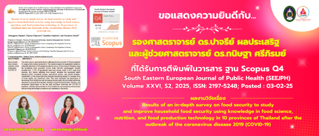 ขอแสดงความยินดีกับ…รองศาสตราจารย์ ดร.ปาจรีย์ ผลประเสริฐ และผู้ช่วยศาสตราจารย์ ดร.กนิษฐา ศรีภิรมย์ ที่ได้รับการตีพิมพ์ในวารสาร ฐาน Scopus Q4 South Eastern EUropean Journal of Public Health (SEEJPH) Volume XXVI, S2, 2025, ISSN: 2197-5248; Posted : 03-02-25 ผลงานวิจัยเรื่อง Results of an in-depth survey on food security to study and improve household food security using knowledge in food science, nutrition, and food production technology in 10…