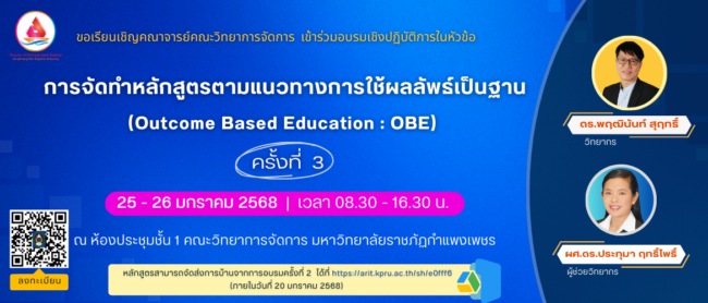 ขอเรียนเชิญคณาจารย์คณะวิทยาการจัดการเข้าร่วมอบรมเชิงปฏิบัติการในหัวข้อ “การจัดทำหลักสูตรตามแนวทางการใช้ผลลัพธ์เป็นฐาน (Outcome Based Education : OBE) ครั้งที่ 3” 📅 ในวันที่ 25 – 26 มกราคม 2568 เวลา 08.30 – 16.30 น. 📌 ณ ห้องประชุมชั้น 1 คณะวิทยาการจัดการ มหาวิทยาลัยราชภัฏกำแพงเพชร ✦ วิทยากรโดย: ดร.พฤฒินันท์ สุฤทธิ์ และทีมงาน ……………………………………. 📝 ทั้งนี้ขอให้แต่ละหลักสูตรจัดส่งการบ้านจากการอบรมครั้งที่ 2 ภายในวันที่ 20 มกราคม 2568 ได้ที่ไดรฟ์: https://arit.kpru.ac.th/sh/e0fff6 ……………………………………. 👉 ตอบรับเข้าร่วมกิจกรรมได้ที่: https://arit.kpru.ac.th/sh/74ea7f ……………………………………. กำหนดการ PDF