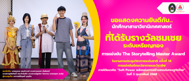 คณะวิทยาการจัดการ ขอแสดงความยินดีกับ…นักศึกษาสาขาวิชานิเทศศาสตร์ ได้แก่ นายภูวดล เสนคำวงค์ นางสาวเมขลา มั่นอินทร์ นางสาวอุทัยทิพย์ พระคำจันทึก นางสาวณัฐณิชา โชคงาม และนายจตุพร สงคุ้ม ที่ได้รับรางวัลชมเชย ระดับเหรียญทอง การแข่งขัน The Storytelling Master Award ปลุกพลังเสียง เล่าเรื่องราว สร้างแรงบันดาลใจ ภายใต้แนวคิด ปลุกพลัง SOFT POWER…เรื่องราวของเทศกาลที่คุณต้องฟัง (Festival) ในงานการประชุมวิชาการระดับชาติ ครั้งที่ 14 : การแข่งขันทักษะวิชาการและวิชาชีพ ภายใต้แนวคิด “Soft Power พลังแห่งการสร้างสรรค์เศรษฐกิจไทย” วันที่ 3 กุมภาพันธ์ 2568 ณ อาคารกิจกรรมนักศึกษา (SAC) มหาวิทยาลัยราชภัฏกำแพงเพชร ควบคุมทีมโดย อาจารย์ธัญรดี บุญปัน