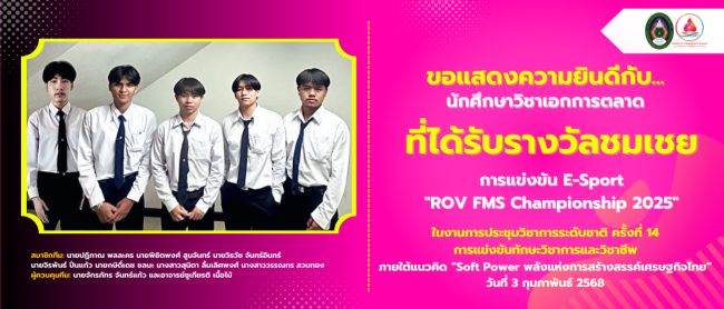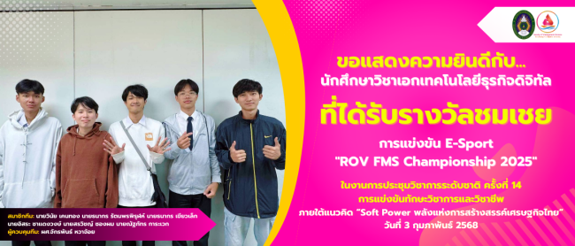คณะวิทยาการจัดการ ขอแสดงความยินดีกับ…นักศึกษาวิชาเอกเทคโนโลยีธุรกิจดิจิทัล ได้แก่ นายวินัย เคนทอง นายธนากร รัตนพรพิรุฬห์ นายธนากร เขียวเล็ก นายอิสระ ชาเเดงวงษ์ นายสรวิชญ์ ซองผม และนายณัฐภัทร การะเวก ที่ได้รับรางวัลชมเชย การแข่งขัน E-Sport “ROV FMS Championship 2025” ในงานการประชุมวิชาการระดับชาติ ครั้งที่ 14 : การแข่งขันทักษะวิชาการและวิชาชีพ ภายใต้แนวคิด “Soft Power พลังแห่งการสร้างสรรค์เศรษฐกิจไทย” วันที่ 3 กุมภาพันธ์ 2568 ณ อาคารกิจกรรมนักศึกษา (SAC) มหาวิทยาลัยราชภัฏกำแพงเพชร ควบคุมทีมโดย ผู้ช่วยศาสตราจารย์จักรพันธ์ หวาจ้อย