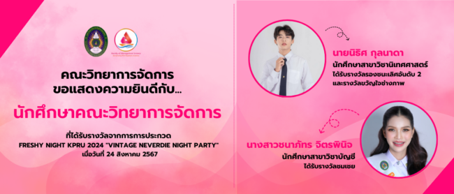 คณะวิทยาการจัดการ มหาวิทยาลัยราชภัฏกำแพงเพชร ขอแสดงความยินดีกับ…นักศึกษาที่ได้รับรางวัลจากการประกวด FRESHY NIGHT KPRU 2024 “VINTAGE NEVERDIE NIGHT PARTY” นายนิธิศ กุลนาดา ได้รับรางวัลรองชนะเลิศอันดับ 2 และรางวัลขวัญใจช่างภาพ นาวสาวชนาภัทร จิตรพินิจ ได้รับรางวัลชมเชย