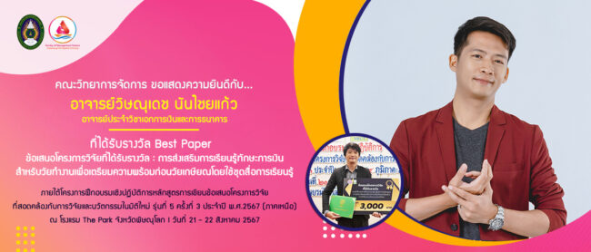 คณะวิทยาการจัดการ ขอแสดงความยินดีกับ… อาจารย์วิษณุเดช นันไชยแก้ว ที่ได้รับรางวัล Best Paper ข้อเสนอโครงการวิจัยที่ได้รับรางวัล :การส่งเสริมการเรียนรู้ทักษะการเงิน สำหรับวัยทำงานเพื่อเตรียมความพร้อมก่อนวัยเกษียณโดยใช้ชุดสื่อการเรียนรู้ ภายใต้โครงการฝึกอบรมเชิงปฏิบัติการหลักสูตรการเขียนข้อเสนอโครงการวิจัยที่สอดคล้องกับการวิจัยและนวัตกรรมในมิติใหม่ รุ่นที่ 5 ครั้งที่ 3 ประจำปี พ.ศ. 2567 (ภาคเหนือ) ณ โรงแรม The Park จังหวัดพิษณุโลก I วันที่ 21 – 22 ส.ค. 67